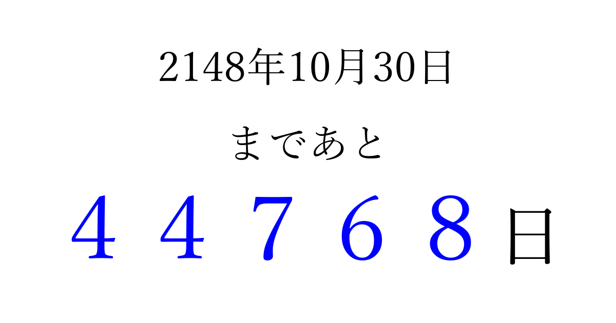 2148年10月30日(水)まで あと 99999 日です 追加すると、トップページからすぐ選べるようになります ※2026/04/05現在の結果です。 最新の状態に更新する ↓シェアして、タイムライン上にカウントダウンを表示しよう!↓ 📤 この結果を共有する Tweet シェア Threads Bluesky 別の日付でカウントダウン 2148年10月のカレンダー このページをブックマークに追加すると、いつでもカウントダウンを確認できます。 (PC: Ctrl+D / Mac: ⌘+D) hitome-notes.comでは以下のページも運営しています。 指定日と期間から日付を計算 | ガチャ確率計算・シミュレーション | プライバシー・ポリシー 運営者:Avocado