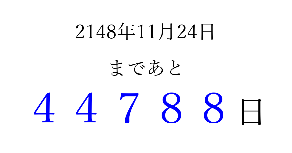 2148年11月24日(日)まで あと 99999 日です 追加すると、トップページからすぐ選べるようになります ※2026/04/10現在の結果です。 最新の状態に更新する ↓シェアして、タイムライン上にカウントダウンを表示しよう!↓ 📤 この結果を共有する Tweet シェア Threads Bluesky 別の日付でカウントダウン 2148年11月のカレンダー このページをブックマークに追加すると、いつでもカウントダウンを確認できます。 (PC: Ctrl+D / Mac: ⌘+D) hitome-notes.comでは以下のページも運営しています。 指定日と期間から日付を計算 | ガチャ確率計算・シミュレーション | プライバシー・ポリシー 運営者:Avocado