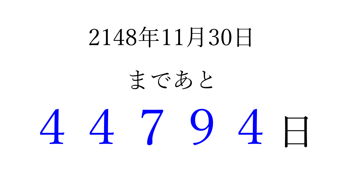 2148年11月30日(土)まで あと 99999 日です 追加すると、トップページからすぐ選べるようになります ※2026/04/10現在の結果です。 最新の状態に更新する ↓シェアして、タイムライン上にカウントダウンを表示しよう!↓ 📤 この結果を共有する Tweet シェア Threads Bluesky 別の日付でカウントダウン 2148年11月のカレンダー このページをブックマークに追加すると、いつでもカウントダウンを確認できます。 (PC: Ctrl+D / Mac: ⌘+D) hitome-notes.comでは以下のページも運営しています。 指定日と期間から日付を計算 | ガチャ確率計算・シミュレーション | プライバシー・ポリシー 運営者:Avocado