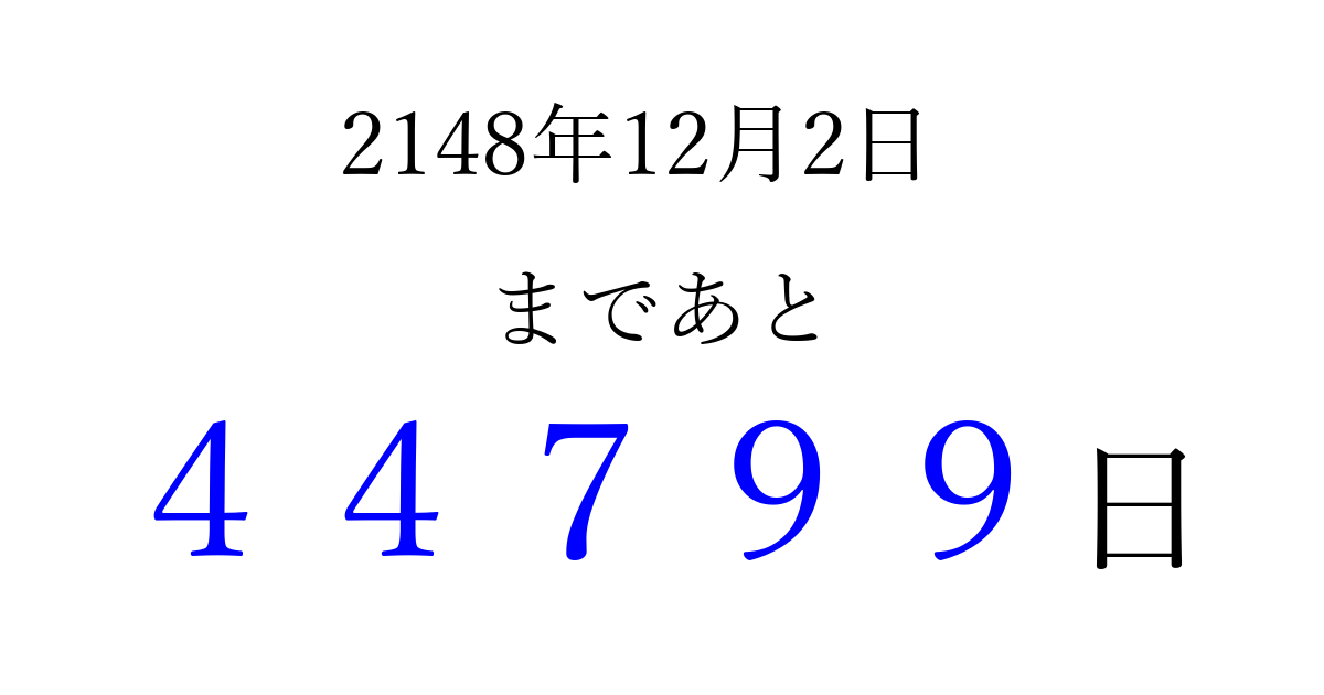 2148年12月2日(月)まで あと 99999 日です 追加すると、トップページからすぐ選べるようになります ※2026/04/07現在の結果です。 最新の状態に更新する ↓シェアして、タイムライン上にカウントダウンを表示しよう!↓ 📤 この結果を共有する Tweet シェア Threads Bluesky 別の日付でカウントダウン 2148年12月のカレンダー このページをブックマークに追加すると、いつでもカウントダウンを確認できます。 (PC: Ctrl+D / Mac: ⌘+D) hitome-notes.comでは以下のページも運営しています。 指定日と期間から日付を計算 | ガチャ確率計算・シミュレーション | プライバシー・ポリシー 運営者:Avocado