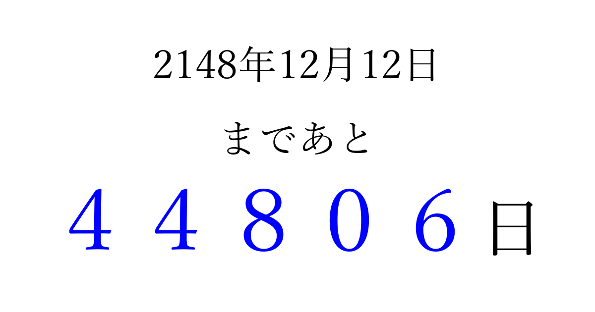 2148年12月12日(木)まで あと 99999 日です 追加すると、トップページからすぐ選べるようになります ※2026/04/10現在の結果です。 最新の状態に更新する ↓シェアして、タイムライン上にカウントダウンを表示しよう!↓ 📤 この結果を共有する Tweet シェア Threads Bluesky 別の日付でカウントダウン 2148年12月のカレンダー このページをブックマークに追加すると、いつでもカウントダウンを確認できます。 (PC: Ctrl+D / Mac: ⌘+D) hitome-notes.comでは以下のページも運営しています。 指定日と期間から日付を計算 | ガチャ確率計算・シミュレーション | プライバシー・ポリシー 運営者:Avocado