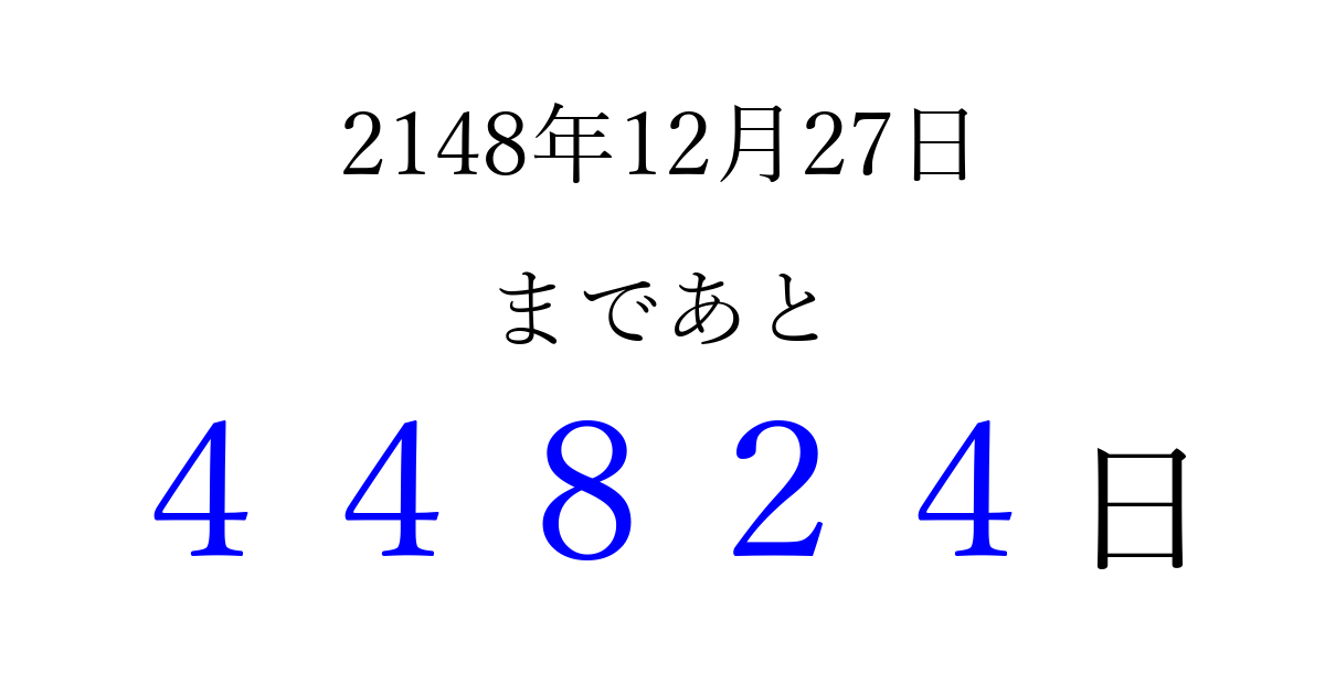2148年12月27日(金)まで あと 99999 日です 追加すると、トップページからすぐ選べるようになります ※2026/04/07現在の結果です。 最新の状態に更新する ↓シェアして、タイムライン上にカウントダウンを表示しよう!↓ 📤 この結果を共有する Tweet シェア Threads Bluesky 別の日付でカウントダウン 2148年12月のカレンダー このページをブックマークに追加すると、いつでもカウントダウンを確認できます。 (PC: Ctrl+D / Mac: ⌘+D) hitome-notes.comでは以下のページも運営しています。 指定日と期間から日付を計算 | ガチャ確率計算・シミュレーション | プライバシー・ポリシー 運営者:Avocado