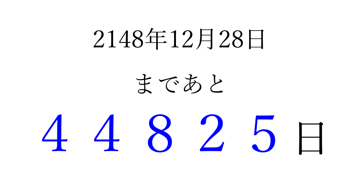 2148年12月28日(土)まで あと 99999 日です 追加すると、トップページからすぐ選べるようになります ※2026/04/07現在の結果です。 最新の状態に更新する ↓シェアして、タイムライン上にカウントダウンを表示しよう!↓ 📤 この結果を共有する Tweet シェア Threads Bluesky 別の日付でカウントダウン 2148年12月のカレンダー このページをブックマークに追加すると、いつでもカウントダウンを確認できます。 (PC: Ctrl+D / Mac: ⌘+D) hitome-notes.comでは以下のページも運営しています。 指定日と期間から日付を計算 | ガチャ確率計算・シミュレーション | プライバシー・ポリシー 運営者:Avocado