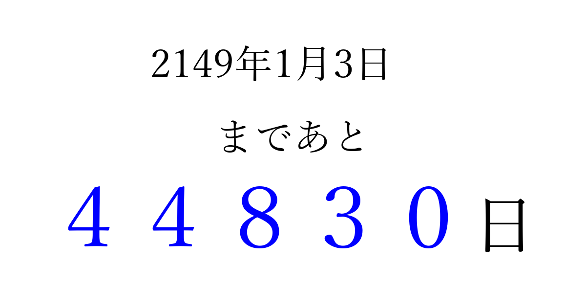 2149年1月3日(金)まで あと 99999 日です 追加すると、トップページからすぐ選べるようになります ※2026/04/08現在の結果です。 最新の状態に更新する ↓シェアして、タイムライン上にカウントダウンを表示しよう!↓ 📤 この結果を共有する Tweet シェア Threads Bluesky 別の日付でカウントダウン 2149年1月のカレンダー このページをブックマークに追加すると、いつでもカウントダウンを確認できます。 (PC: Ctrl+D / Mac: ⌘+D) hitome-notes.comでは以下のページも運営しています。 指定日と期間から日付を計算 | ガチャ確率計算・シミュレーション | プライバシー・ポリシー 運営者:Avocado