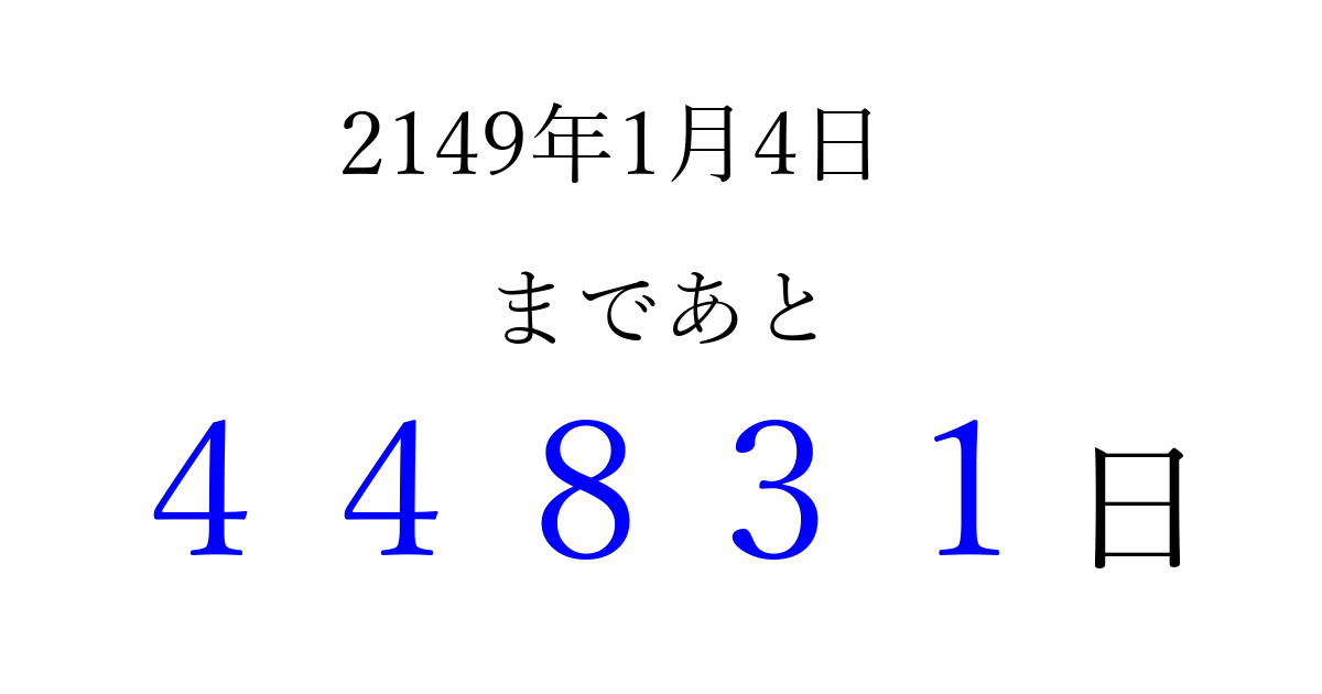 2149年1月4日(土)まで あと 99999 日です 追加すると、トップページからすぐ選べるようになります ※2026/04/08現在の結果です。 最新の状態に更新する ↓シェアして、タイムライン上にカウントダウンを表示しよう!↓ 📤 この結果を共有する Tweet シェア Threads Bluesky 別の日付でカウントダウン 2149年1月のカレンダー このページをブックマークに追加すると、いつでもカウントダウンを確認できます。 (PC: Ctrl+D / Mac: ⌘+D) hitome-notes.comでは以下のページも運営しています。 指定日と期間から日付を計算 | ガチャ確率計算・シミュレーション | プライバシー・ポリシー 運営者:Avocado