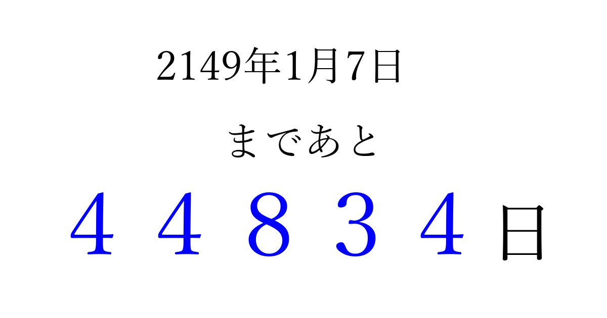2149年1月7日(火)まで あと 99999 日です 追加すると、トップページからすぐ選べるようになります ※2026/04/08現在の結果です。 最新の状態に更新する ↓シェアして、タイムライン上にカウントダウンを表示しよう!↓ 📤 この結果を共有する Tweet シェア Threads Bluesky 別の日付でカウントダウン 2149年1月のカレンダー このページをブックマークに追加すると、いつでもカウントダウンを確認できます。 (PC: Ctrl+D / Mac: ⌘+D) hitome-notes.comでは以下のページも運営しています。 指定日と期間から日付を計算 | ガチャ確率計算・シミュレーション | プライバシー・ポリシー 運営者:Avocado