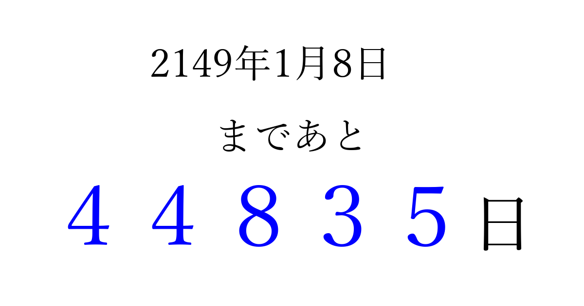 2149年1月8日(水)まで あと 99999 日です 追加すると、トップページからすぐ選べるようになります ※2026/04/08現在の結果です。 最新の状態に更新する ↓シェアして、タイムライン上にカウントダウンを表示しよう!↓ 📤 この結果を共有する Tweet シェア Threads Bluesky 別の日付でカウントダウン 2149年1月のカレンダー このページをブックマークに追加すると、いつでもカウントダウンを確認できます。 (PC: Ctrl+D / Mac: ⌘+D) hitome-notes.comでは以下のページも運営しています。 指定日と期間から日付を計算 | ガチャ確率計算・シミュレーション | プライバシー・ポリシー 運営者:Avocado