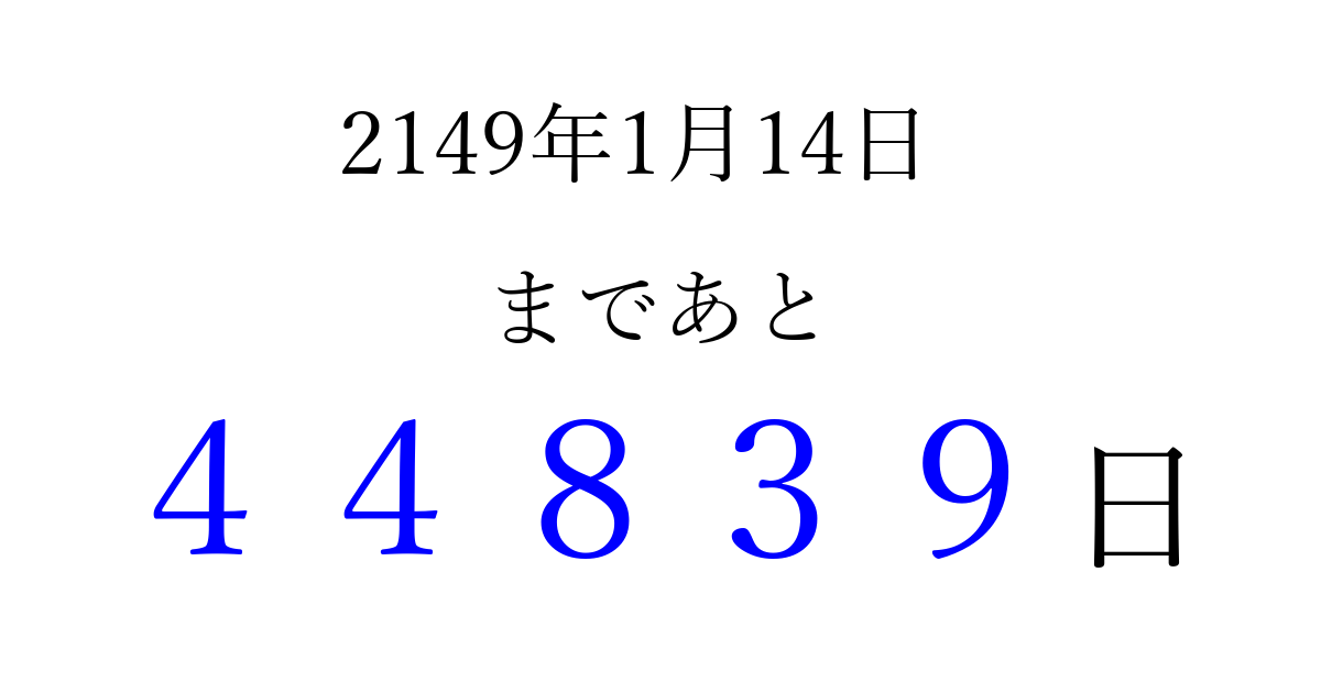 2149年1月14日(火)まで あと 99999 日です 追加すると、トップページからすぐ選べるようになります ※2026/04/10現在の結果です。 最新の状態に更新する ↓シェアして、タイムライン上にカウントダウンを表示しよう!↓ 📤 この結果を共有する Tweet シェア Threads Bluesky 別の日付でカウントダウン 2149年1月のカレンダー このページをブックマークに追加すると、いつでもカウントダウンを確認できます。 (PC: Ctrl+D / Mac: ⌘+D) hitome-notes.comでは以下のページも運営しています。 指定日と期間から日付を計算 | ガチャ確率計算・シミュレーション | プライバシー・ポリシー 運営者:Avocado