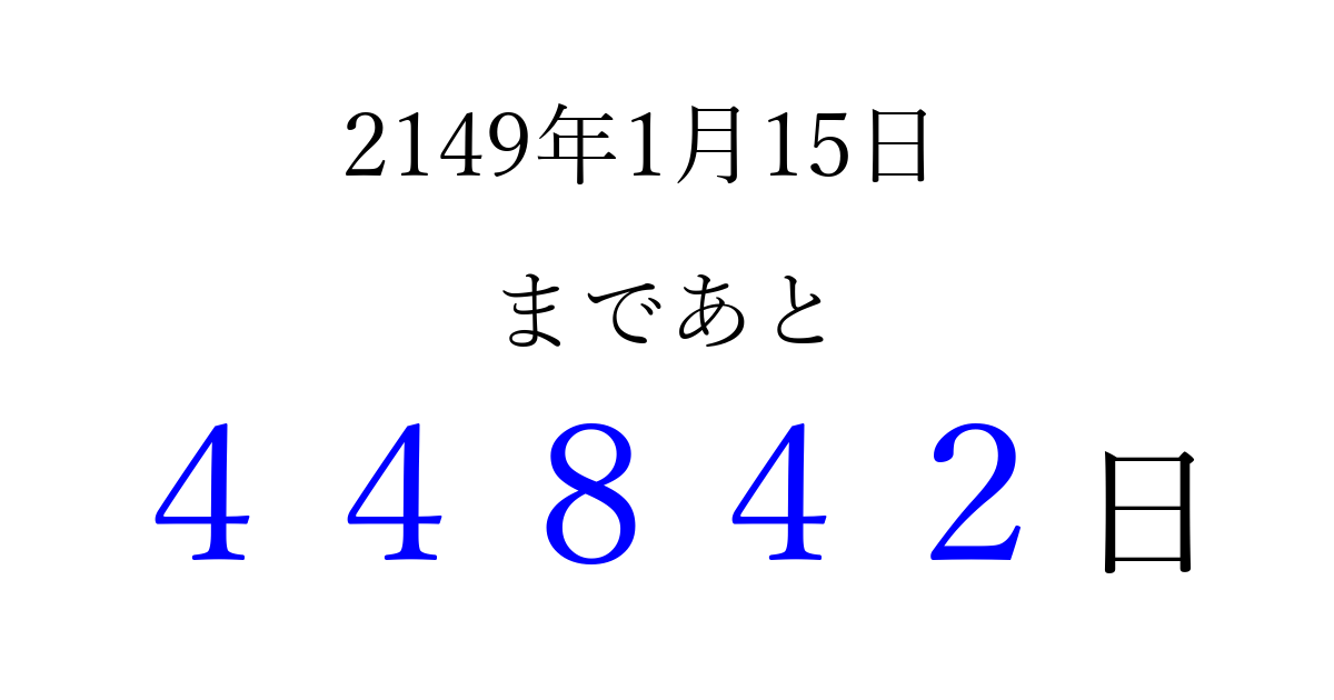 2149年1月15日(水)まで あと 99999 日です 追加すると、トップページからすぐ選べるようになります ※2026/04/08現在の結果です。 最新の状態に更新する ↓シェアして、タイムライン上にカウントダウンを表示しよう!↓ 📤 この結果を共有する Tweet シェア Threads Bluesky 別の日付でカウントダウン 2149年1月のカレンダー このページをブックマークに追加すると、いつでもカウントダウンを確認できます。 (PC: Ctrl+D / Mac: ⌘+D) hitome-notes.comでは以下のページも運営しています。 指定日と期間から日付を計算 | ガチャ確率計算・シミュレーション | プライバシー・ポリシー 運営者:Avocado