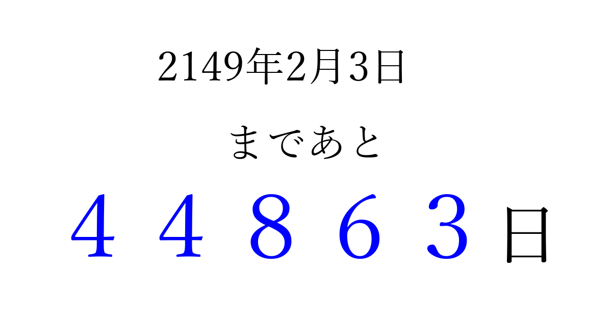 2149年2月3日(月)まで あと 99999 日です 追加すると、トップページからすぐ選べるようになります ※2026/04/06現在の結果です。 最新の状態に更新する ↓シェアして、タイムライン上にカウントダウンを表示しよう!↓ 📤 この結果を共有する Tweet シェア Threads Bluesky 別の日付でカウントダウン 2149年2月のカレンダー このページをブックマークに追加すると、いつでもカウントダウンを確認できます。 (PC: Ctrl+D / Mac: ⌘+D) hitome-notes.comでは以下のページも運営しています。 指定日と期間から日付を計算 | ガチャ確率計算・シミュレーション | プライバシー・ポリシー 運営者:Avocado