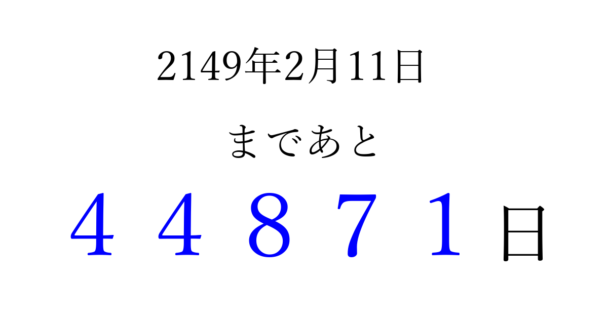 2149年2月11日(火)まで あと 99999 日です 追加すると、トップページからすぐ選べるようになります ※2026/04/06現在の結果です。 最新の状態に更新する ↓シェアして、タイムライン上にカウントダウンを表示しよう!↓ 📤 この結果を共有する Tweet シェア Threads Bluesky 別の日付でカウントダウン 2149年2月のカレンダー このページをブックマークに追加すると、いつでもカウントダウンを確認できます。 (PC: Ctrl+D / Mac: ⌘+D) hitome-notes.comでは以下のページも運営しています。 指定日と期間から日付を計算 | ガチャ確率計算・シミュレーション | プライバシー・ポリシー 運営者:Avocado