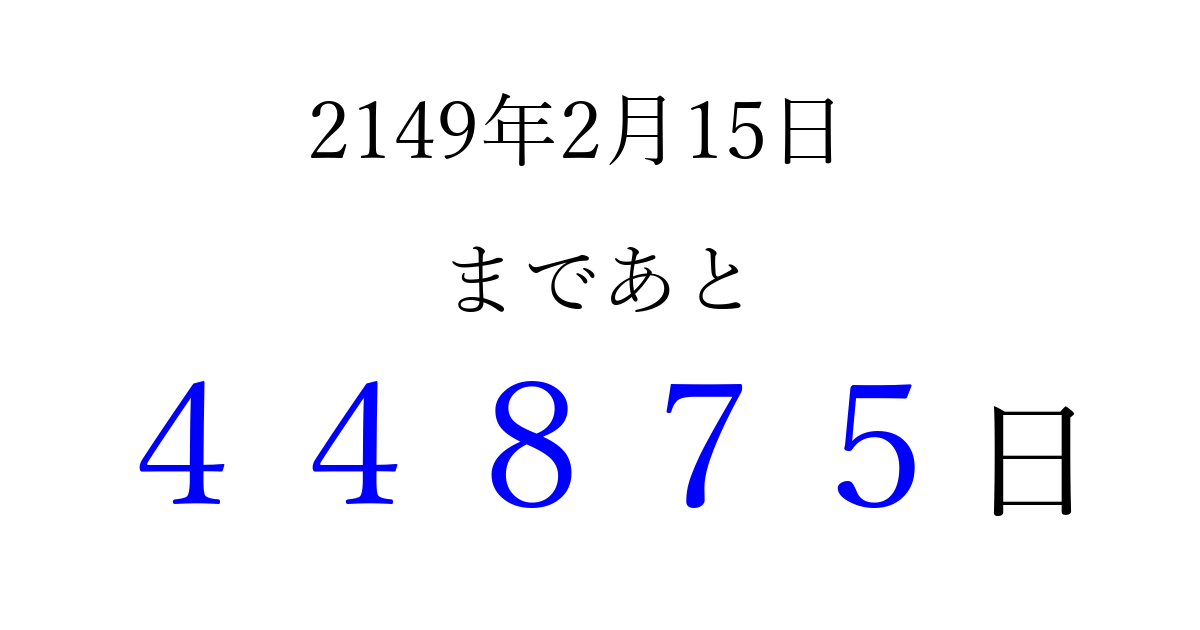 2149年2月15日(土)まで あと 99999 日です 追加すると、トップページからすぐ選べるようになります ※2026/04/06現在の結果です。 最新の状態に更新する ↓シェアして、タイムライン上にカウントダウンを表示しよう!↓ 📤 この結果を共有する Tweet シェア Threads Bluesky 別の日付でカウントダウン 2149年2月のカレンダー このページをブックマークに追加すると、いつでもカウントダウンを確認できます。 (PC: Ctrl+D / Mac: ⌘+D) hitome-notes.comでは以下のページも運営しています。 指定日と期間から日付を計算 | ガチャ確率計算・シミュレーション | プライバシー・ポリシー 運営者:Avocado