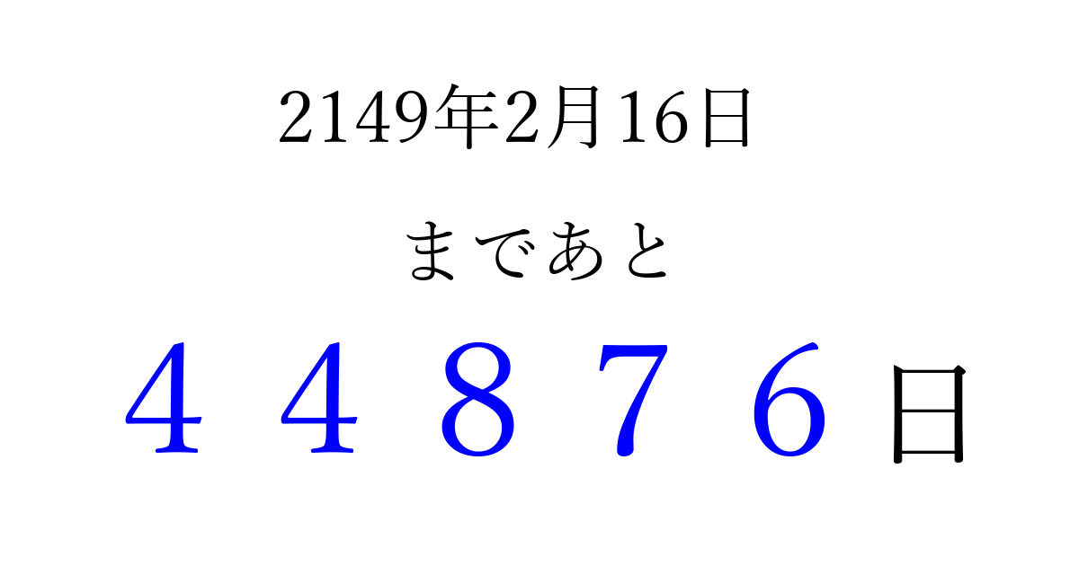 2149年2月16日(日)まで あと 99999 日です 追加すると、トップページからすぐ選べるようになります ※2026/04/06現在の結果です。 最新の状態に更新する ↓シェアして、タイムライン上にカウントダウンを表示しよう!↓ 📤 この結果を共有する Tweet シェア Threads Bluesky 別の日付でカウントダウン 2149年2月のカレンダー このページをブックマークに追加すると、いつでもカウントダウンを確認できます。 (PC: Ctrl+D / Mac: ⌘+D) hitome-notes.comでは以下のページも運営しています。 指定日と期間から日付を計算 | ガチャ確率計算・シミュレーション | プライバシー・ポリシー 運営者:Avocado