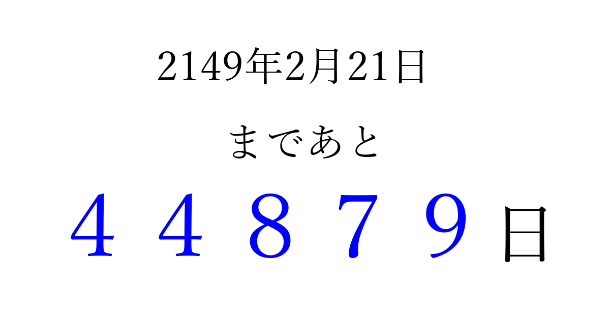 2149年2月21日(金)まで あと 99999 日です 追加すると、トップページからすぐ選べるようになります ※2026/04/08現在の結果です。 最新の状態に更新する ↓シェアして、タイムライン上にカウントダウンを表示しよう!↓ 📤 この結果を共有する Tweet シェア Threads Bluesky 別の日付でカウントダウン 2149年2月のカレンダー このページをブックマークに追加すると、いつでもカウントダウンを確認できます。 (PC: Ctrl+D / Mac: ⌘+D) hitome-notes.comでは以下のページも運営しています。 指定日と期間から日付を計算 | ガチャ確率計算・シミュレーション | プライバシー・ポリシー 運営者:Avocado