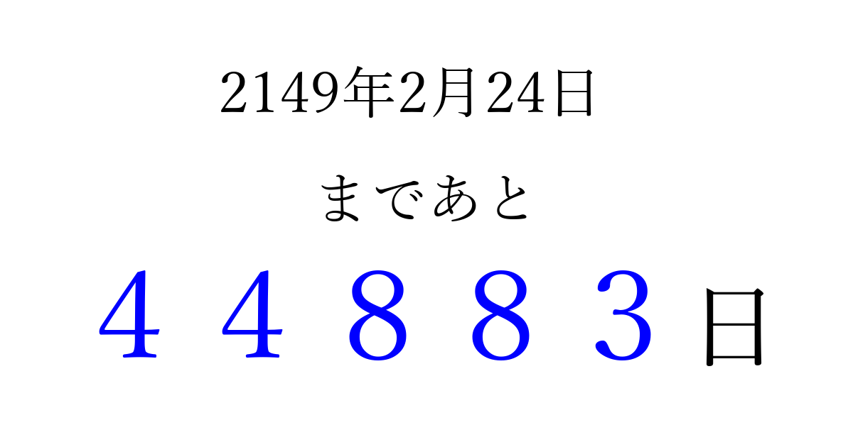 2149年2月24日(月)まで あと 99999 日です 追加すると、トップページからすぐ選べるようになります ※2026/04/07現在の結果です。 最新の状態に更新する ↓シェアして、タイムライン上にカウントダウンを表示しよう!↓ 📤 この結果を共有する Tweet シェア Threads Bluesky 別の日付でカウントダウン 2149年2月のカレンダー このページをブックマークに追加すると、いつでもカウントダウンを確認できます。 (PC: Ctrl+D / Mac: ⌘+D) hitome-notes.comでは以下のページも運営しています。 指定日と期間から日付を計算 | ガチャ確率計算・シミュレーション | プライバシー・ポリシー 運営者:Avocado