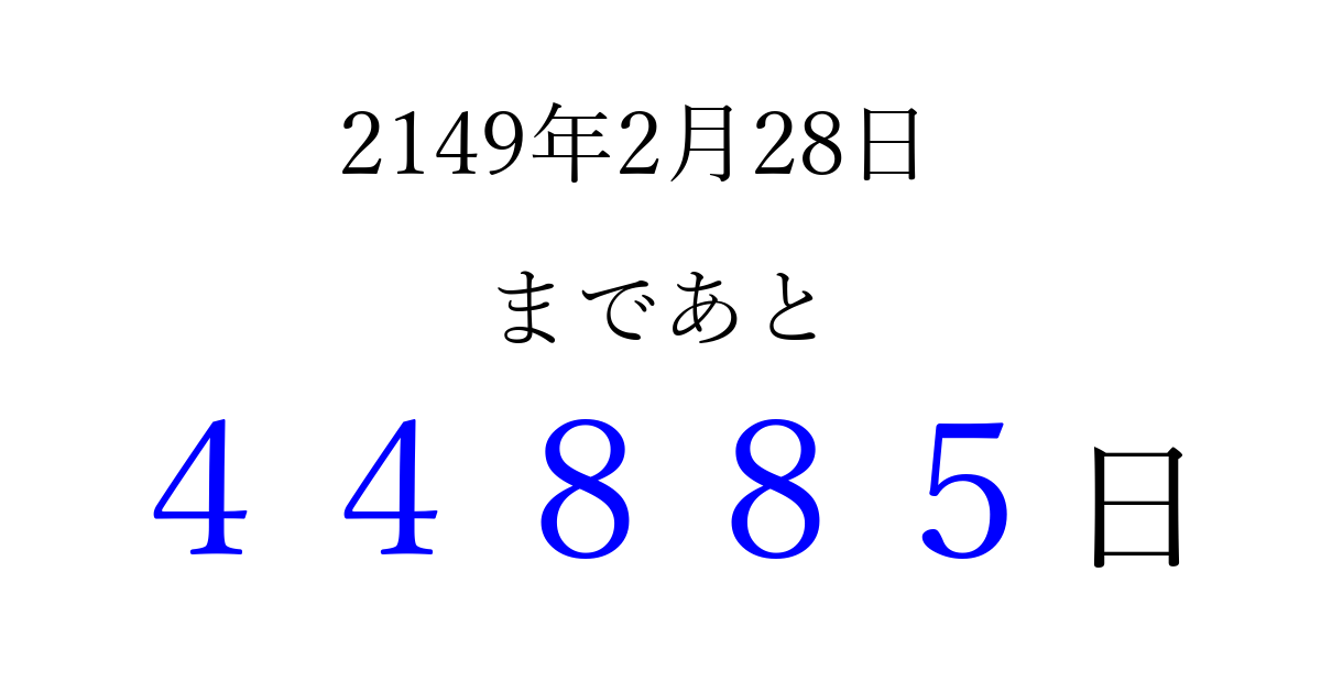 2149年2月28日(金)まで あと 99999 日です 追加すると、トップページからすぐ選べるようになります ※2026/04/09現在の結果です。 最新の状態に更新する ↓シェアして、タイムライン上にカウントダウンを表示しよう!↓ 📤 この結果を共有する Tweet シェア Threads Bluesky 別の日付でカウントダウン 2149年2月のカレンダー このページをブックマークに追加すると、いつでもカウントダウンを確認できます。 (PC: Ctrl+D / Mac: ⌘+D) hitome-notes.comでは以下のページも運営しています。 指定日と期間から日付を計算 | ガチャ確率計算・シミュレーション | プライバシー・ポリシー 運営者:Avocado