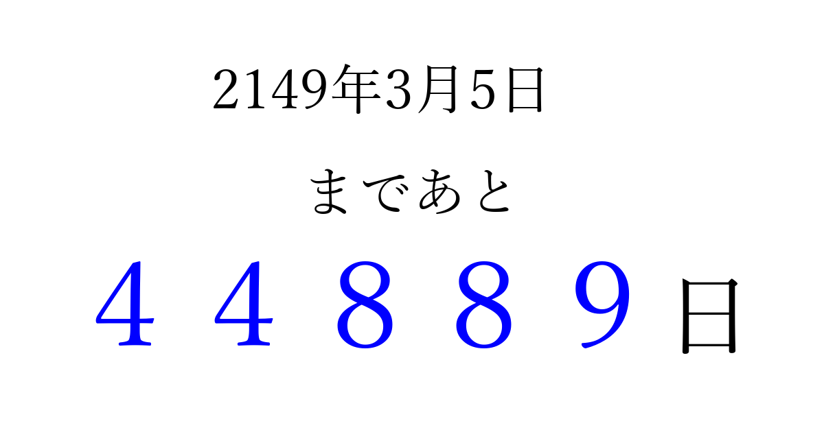 2149年3月5日(水)まで あと 99999 日です 追加すると、トップページからすぐ選べるようになります ※2026/04/10現在の結果です。 最新の状態に更新する ↓シェアして、タイムライン上にカウントダウンを表示しよう!↓ 📤 この結果を共有する Tweet シェア Threads Bluesky 別の日付でカウントダウン 2149年3月のカレンダー このページをブックマークに追加すると、いつでもカウントダウンを確認できます。 (PC: Ctrl+D / Mac: ⌘+D) hitome-notes.comでは以下のページも運営しています。 指定日と期間から日付を計算 | ガチャ確率計算・シミュレーション | プライバシー・ポリシー 運営者:Avocado