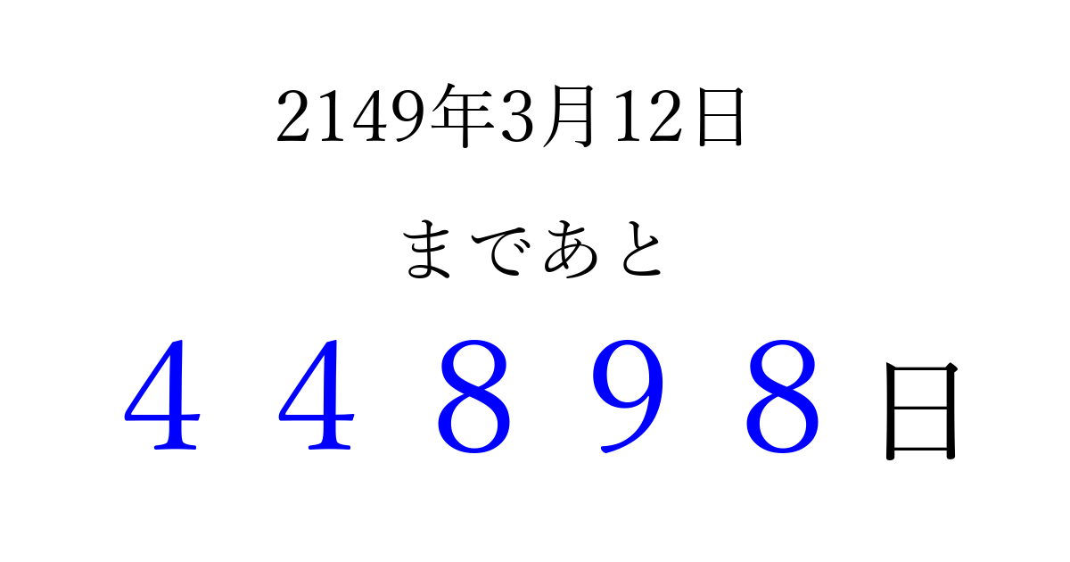 2149年3月12日(水)まで あと 99999 日です 追加すると、トップページからすぐ選べるようになります ※2026/04/08現在の結果です。 最新の状態に更新する ↓シェアして、タイムライン上にカウントダウンを表示しよう!↓ 📤 この結果を共有する Tweet シェア Threads Bluesky 別の日付でカウントダウン 2149年3月のカレンダー このページをブックマークに追加すると、いつでもカウントダウンを確認できます。 (PC: Ctrl+D / Mac: ⌘+D) hitome-notes.comでは以下のページも運営しています。 指定日と期間から日付を計算 | ガチャ確率計算・シミュレーション | プライバシー・ポリシー 運営者:Avocado