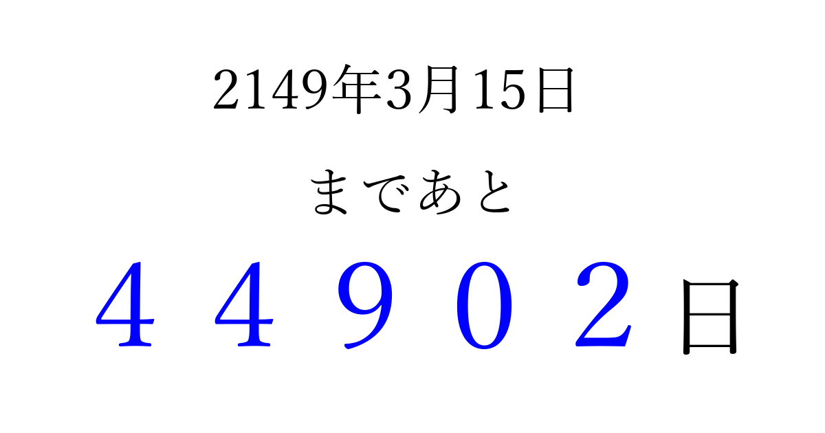 2149年3月15日(土)まで あと 99999 日です 追加すると、トップページからすぐ選べるようになります ※2026/04/07現在の結果です。 最新の状態に更新する ↓シェアして、タイムライン上にカウントダウンを表示しよう!↓ 📤 この結果を共有する Tweet シェア Threads Bluesky 別の日付でカウントダウン 2149年3月のカレンダー このページをブックマークに追加すると、いつでもカウントダウンを確認できます。 (PC: Ctrl+D / Mac: ⌘+D) hitome-notes.comでは以下のページも運営しています。 指定日と期間から日付を計算 | ガチャ確率計算・シミュレーション | プライバシー・ポリシー 運営者:Avocado