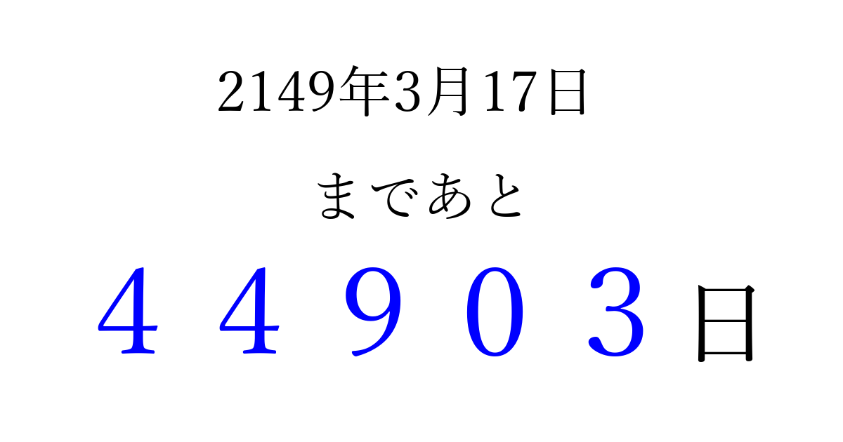 2149年3月17日(月)まで あと 99999 日です 追加すると、トップページからすぐ選べるようになります ※2026/04/08現在の結果です。 最新の状態に更新する ↓シェアして、タイムライン上にカウントダウンを表示しよう!↓ 📤 この結果を共有する Tweet シェア Threads Bluesky 別の日付でカウントダウン 2149年3月のカレンダー このページをブックマークに追加すると、いつでもカウントダウンを確認できます。 (PC: Ctrl+D / Mac: ⌘+D) hitome-notes.comでは以下のページも運営しています。 指定日と期間から日付を計算 | ガチャ確率計算・シミュレーション | プライバシー・ポリシー 運営者:Avocado