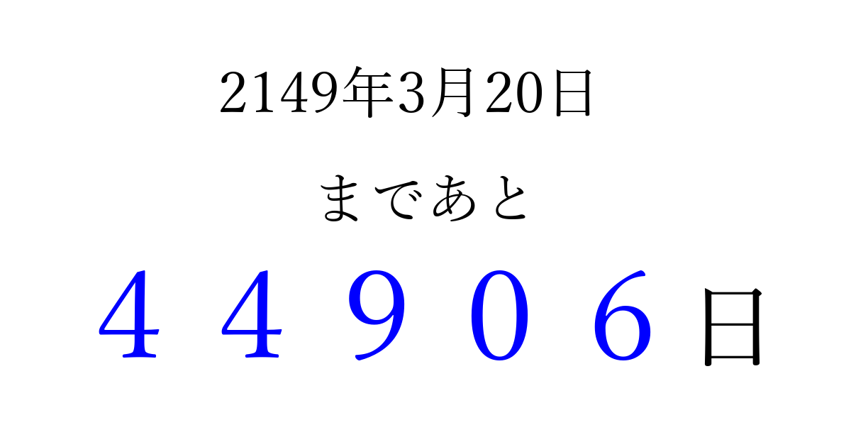 2149年3月20日(木)まで あと 99999 日です 追加すると、トップページからすぐ選べるようになります ※2026/04/08現在の結果です。 最新の状態に更新する ↓シェアして、タイムライン上にカウントダウンを表示しよう!↓ 📤 この結果を共有する Tweet シェア Threads Bluesky 別の日付でカウントダウン 2149年3月のカレンダー このページをブックマークに追加すると、いつでもカウントダウンを確認できます。 (PC: Ctrl+D / Mac: ⌘+D) hitome-notes.comでは以下のページも運営しています。 指定日と期間から日付を計算 | ガチャ確率計算・シミュレーション | プライバシー・ポリシー 運営者:Avocado