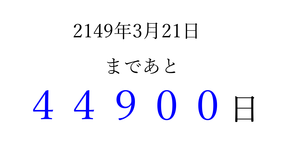 2149年3月21日(金)まで あと 99999 日です 追加すると、トップページからすぐ選べるようになります ※2026/04/15現在の結果です。 最新の状態に更新する ↓シェアして、タイムライン上にカウントダウンを表示しよう!↓ 📤 この結果を共有する Tweet シェア Threads Bluesky 別の日付でカウントダウン 2149年3月のカレンダー このページをブックマークに追加すると、いつでもカウントダウンを確認できます。 (PC: Ctrl+D / Mac: ⌘+D) hitome-notes.comでは以下のページも運営しています。 指定日と期間から日付を計算 | ガチャ確率計算・シミュレーション | プライバシー・ポリシー 運営者:Avocado