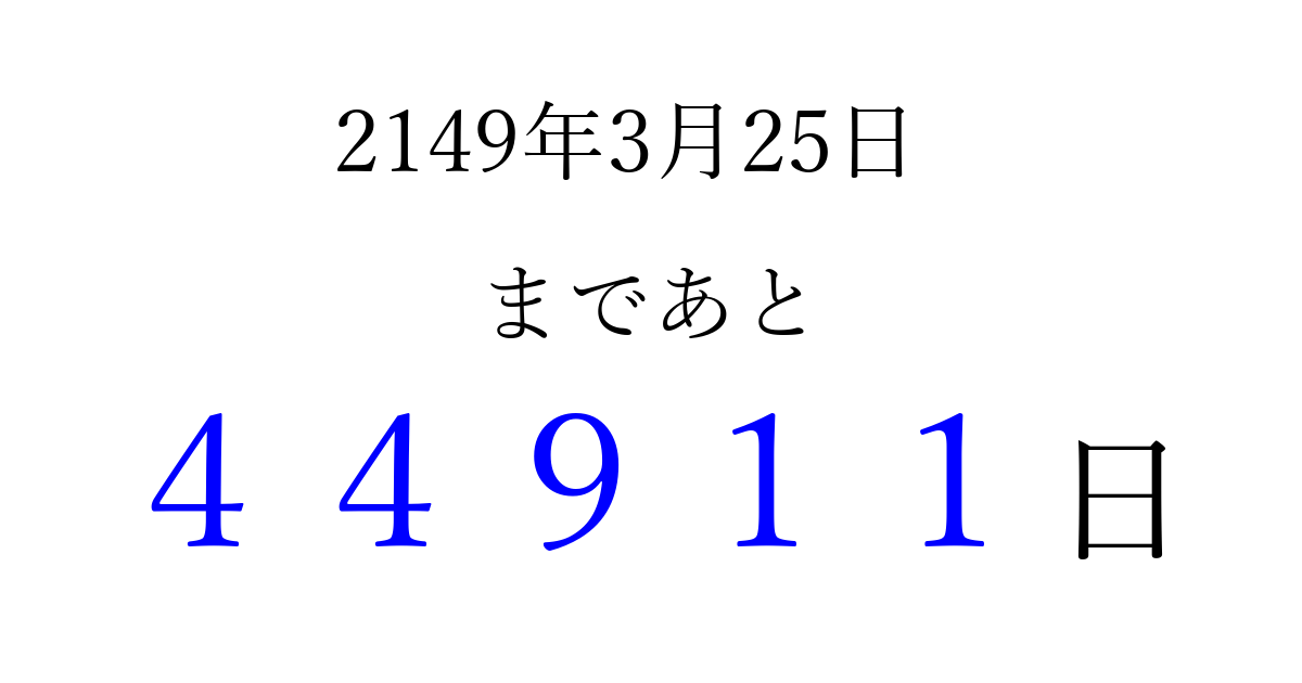 2149年3月25日(火)まで あと 99999 日です 追加すると、トップページからすぐ選べるようになります ※2026/04/08現在の結果です。 最新の状態に更新する ↓シェアして、タイムライン上にカウントダウンを表示しよう!↓ 📤 この結果を共有する Tweet シェア Threads Bluesky 別の日付でカウントダウン 2149年3月のカレンダー このページをブックマークに追加すると、いつでもカウントダウンを確認できます。 (PC: Ctrl+D / Mac: ⌘+D) hitome-notes.comでは以下のページも運営しています。 指定日と期間から日付を計算 | ガチャ確率計算・シミュレーション | プライバシー・ポリシー 運営者:Avocado