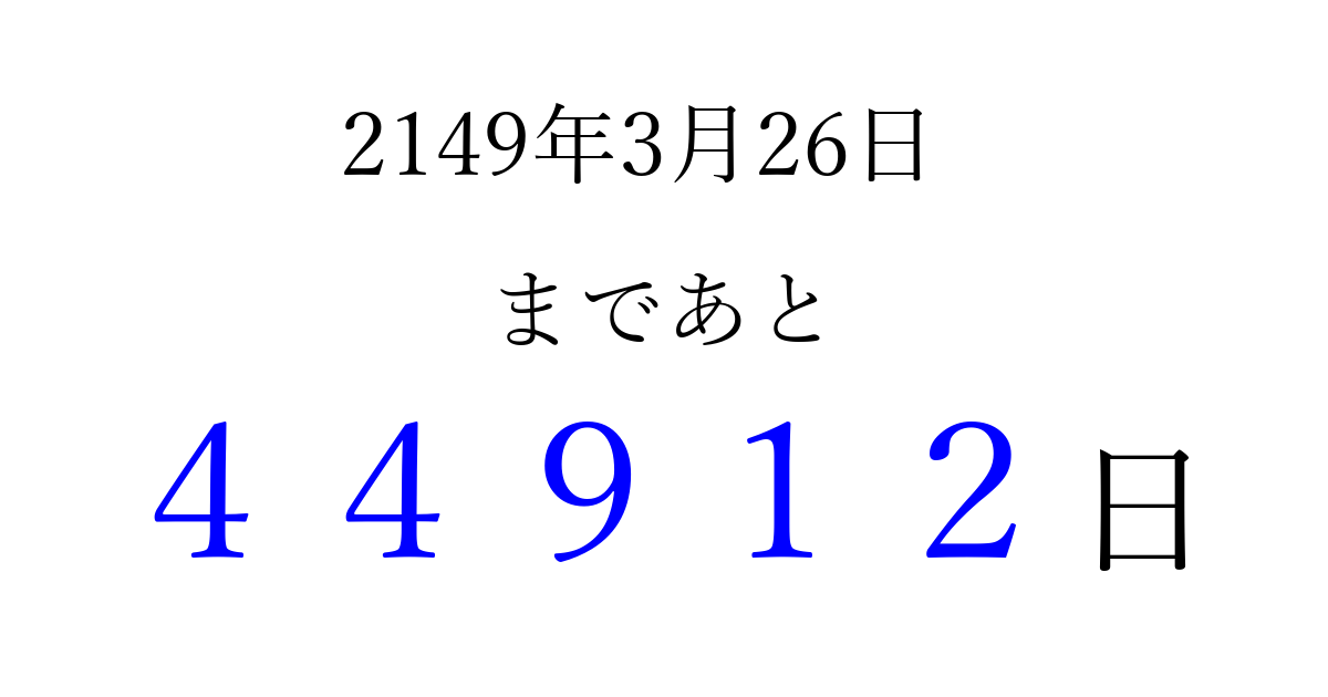 2149年3月26日(水)まで あと 99999 日です 追加すると、トップページからすぐ選べるようになります ※2026/04/08現在の結果です。 最新の状態に更新する ↓シェアして、タイムライン上にカウントダウンを表示しよう!↓ 📤 この結果を共有する Tweet シェア Threads Bluesky 別の日付でカウントダウン 2149年3月のカレンダー このページをブックマークに追加すると、いつでもカウントダウンを確認できます。 (PC: Ctrl+D / Mac: ⌘+D) hitome-notes.comでは以下のページも運営しています。 指定日と期間から日付を計算 | ガチャ確率計算・シミュレーション | プライバシー・ポリシー 運営者:Avocado