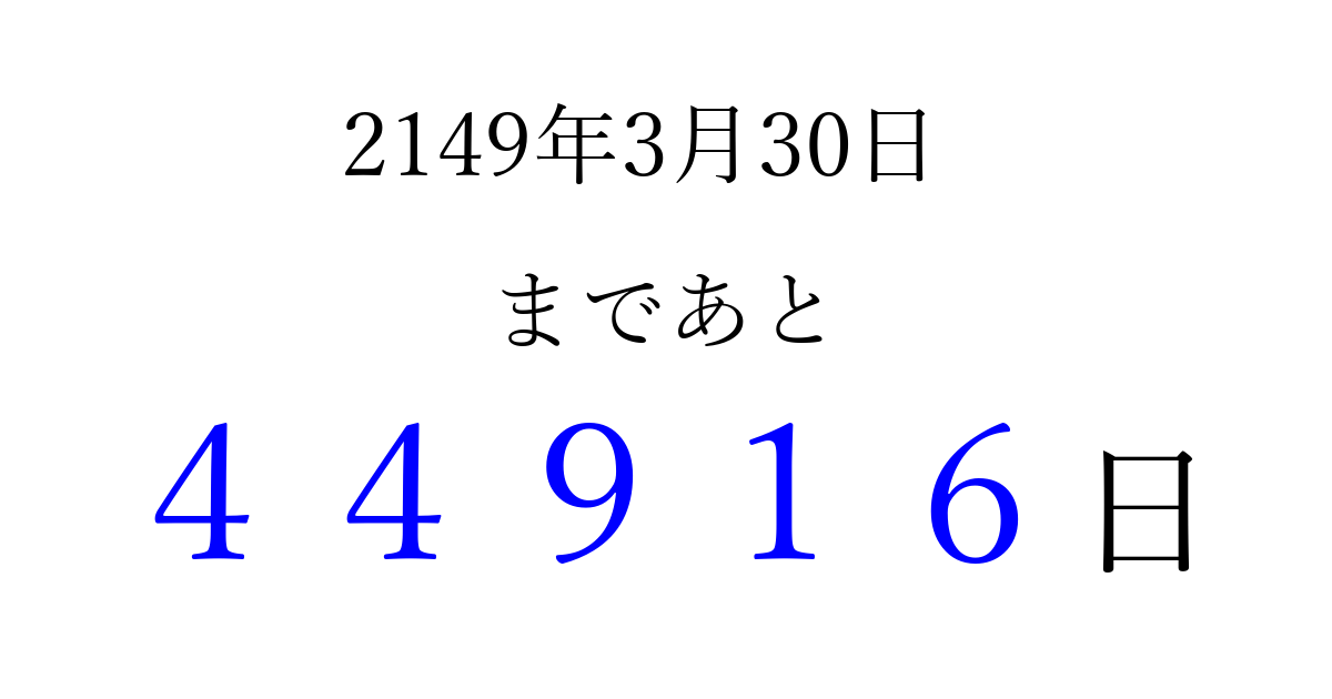 2149年3月30日(日)まで あと 99999 日です 追加すると、トップページからすぐ選べるようになります ※2026/04/08現在の結果です。 最新の状態に更新する ↓シェアして、タイムライン上にカウントダウンを表示しよう!↓ 📤 この結果を共有する Tweet シェア Threads Bluesky 別の日付でカウントダウン 2149年3月のカレンダー このページをブックマークに追加すると、いつでもカウントダウンを確認できます。 (PC: Ctrl+D / Mac: ⌘+D) hitome-notes.comでは以下のページも運営しています。 指定日と期間から日付を計算 | ガチャ確率計算・シミュレーション | プライバシー・ポリシー 運営者:Avocado