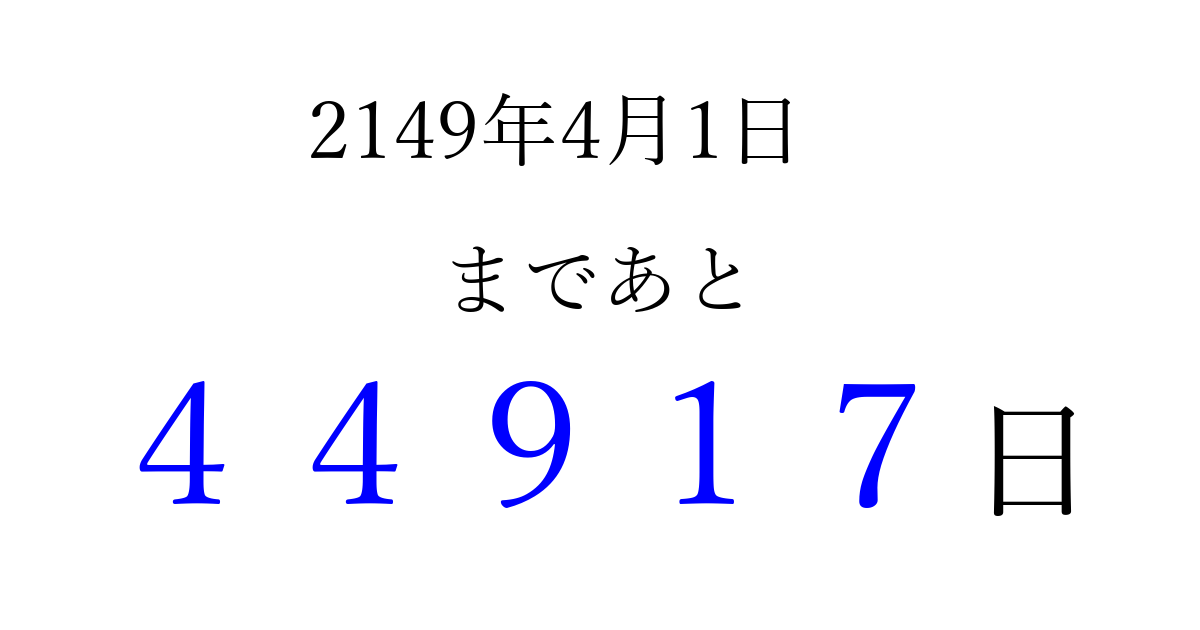 2149年4月1日(火)まで あと 99999 日です 追加すると、トップページからすぐ選べるようになります ※2026/04/09現在の結果です。 最新の状態に更新する ↓シェアして、タイムライン上にカウントダウンを表示しよう!↓ 📤 この結果を共有する Tweet シェア Threads Bluesky 別の日付でカウントダウン 2149年4月のカレンダー このページをブックマークに追加すると、いつでもカウントダウンを確認できます。 (PC: Ctrl+D / Mac: ⌘+D) hitome-notes.comでは以下のページも運営しています。 指定日と期間から日付を計算 | ガチャ確率計算・シミュレーション | プライバシー・ポリシー 運営者:Avocado
