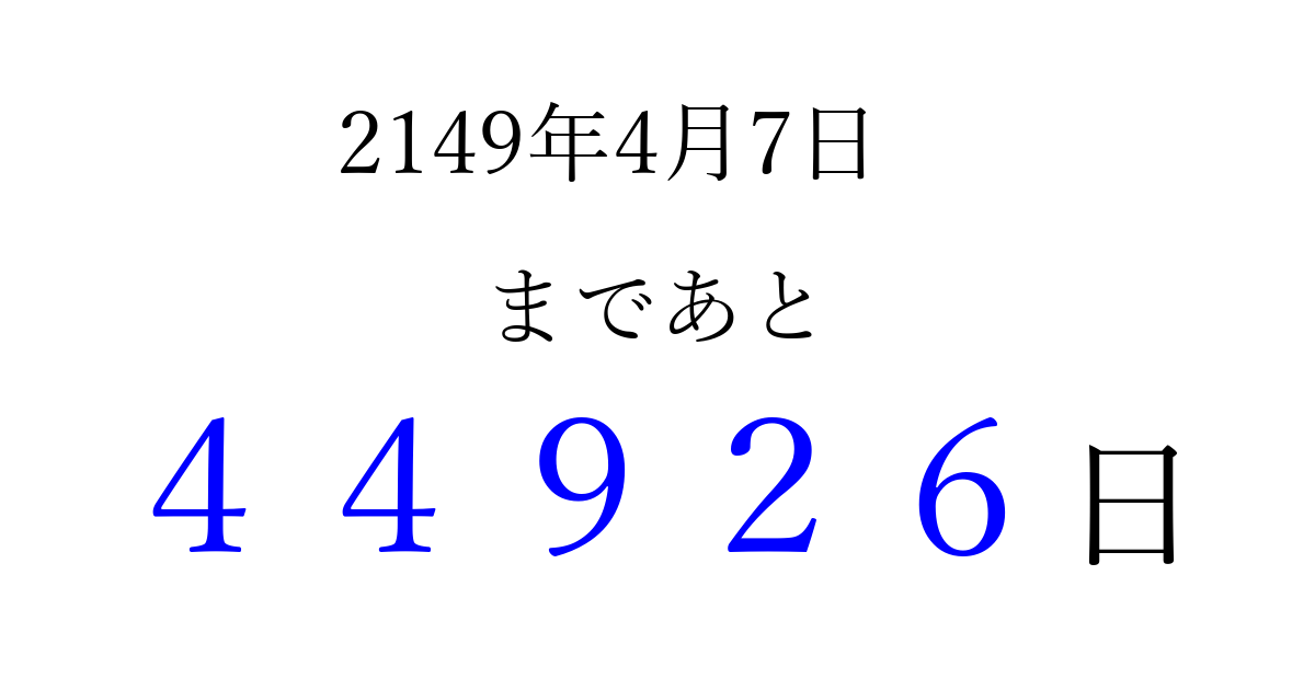 2149年4月7日(月)まで あと 99999 日です 追加すると、トップページからすぐ選べるようになります ※2026/04/06現在の結果です。 最新の状態に更新する ↓シェアして、タイムライン上にカウントダウンを表示しよう!↓ 📤 この結果を共有する Tweet シェア Threads Bluesky 別の日付でカウントダウン 2149年4月のカレンダー このページをブックマークに追加すると、いつでもカウントダウンを確認できます。 (PC: Ctrl+D / Mac: ⌘+D) hitome-notes.comでは以下のページも運営しています。 指定日と期間から日付を計算 | ガチャ確率計算・シミュレーション | プライバシー・ポリシー 運営者:Avocado
