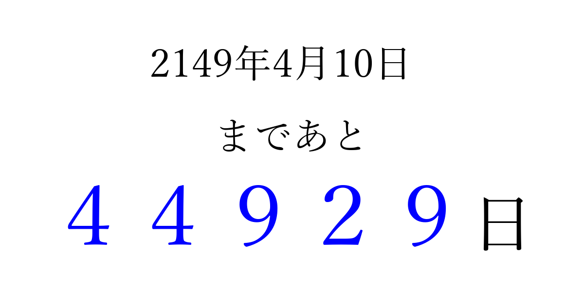2149年4月10日(木)まで あと 99999 日です 追加すると、トップページからすぐ選べるようになります ※2026/04/06現在の結果です。 最新の状態に更新する ↓シェアして、タイムライン上にカウントダウンを表示しよう!↓ 📤 この結果を共有する Tweet シェア Threads Bluesky 別の日付でカウントダウン 2149年4月のカレンダー このページをブックマークに追加すると、いつでもカウントダウンを確認できます。 (PC: Ctrl+D / Mac: ⌘+D) hitome-notes.comでは以下のページも運営しています。 指定日と期間から日付を計算 | ガチャ確率計算・シミュレーション | プライバシー・ポリシー 運営者:Avocado