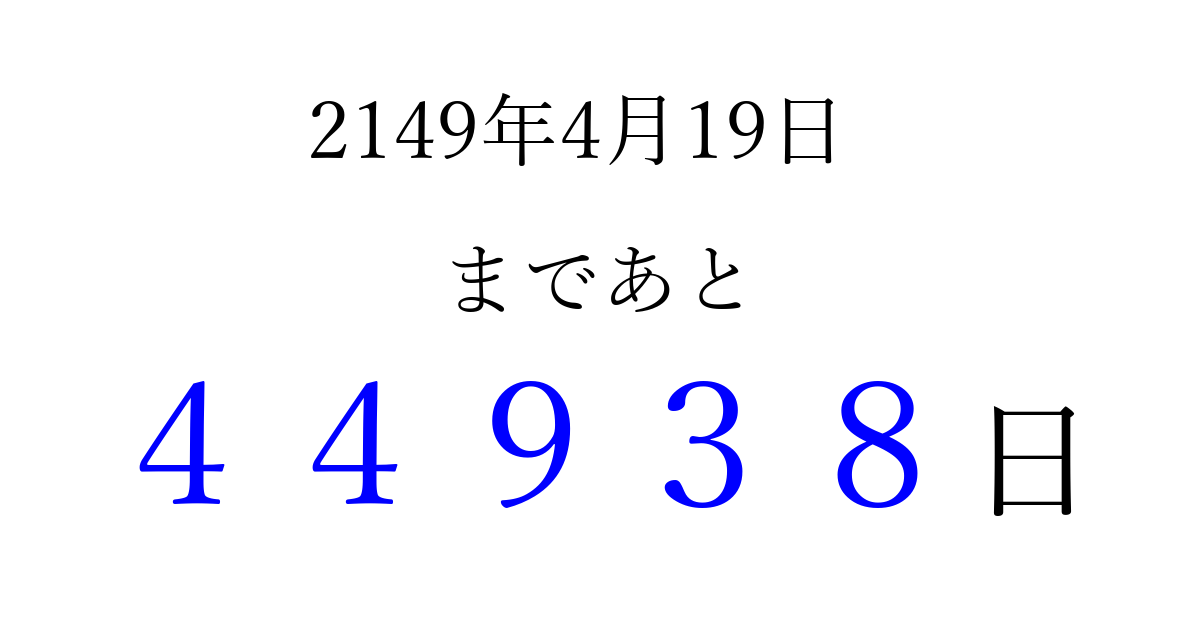 2149年4月19日(土)まで あと 99999 日です 追加すると、トップページからすぐ選べるようになります ※2026/04/06現在の結果です。 最新の状態に更新する ↓シェアして、タイムライン上にカウントダウンを表示しよう!↓ 📤 この結果を共有する Tweet シェア Threads Bluesky 別の日付でカウントダウン 2149年4月のカレンダー このページをブックマークに追加すると、いつでもカウントダウンを確認できます。 (PC: Ctrl+D / Mac: ⌘+D) hitome-notes.comでは以下のページも運営しています。 指定日と期間から日付を計算 | ガチャ確率計算・シミュレーション | プライバシー・ポリシー 運営者:Avocado