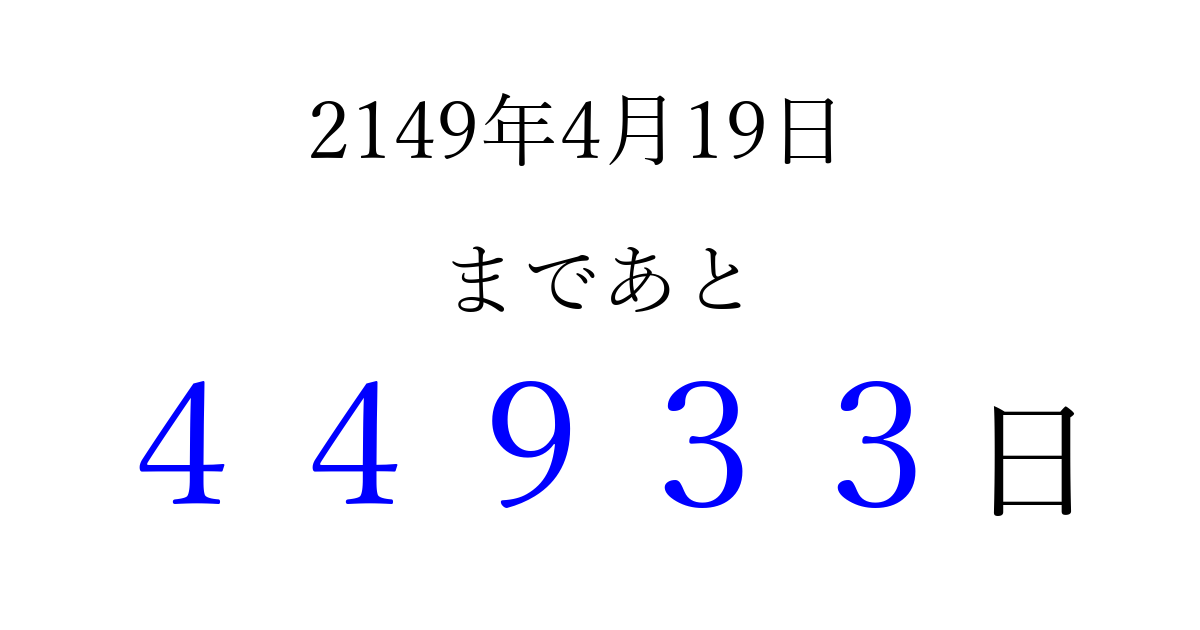 2149年4月19日(土)まで あと 99999 日です 追加すると、トップページからすぐ選べるようになります ※2026/04/11現在の結果です。 最新の状態に更新する ↓シェアして、タイムライン上にカウントダウンを表示しよう!↓ 📤 この結果を共有する Tweet シェア Threads Bluesky 別の日付でカウントダウン 2149年4月のカレンダー このページをブックマークに追加すると、いつでもカウントダウンを確認できます。 (PC: Ctrl+D / Mac: ⌘+D) hitome-notes.comでは以下のページも運営しています。 指定日と期間から日付を計算 | ガチャ確率計算・シミュレーション | プライバシー・ポリシー 運営者:Avocado