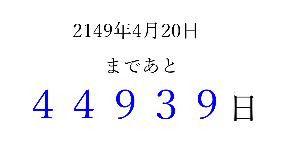 2149年4月20日(日)まで あと 99999 日です 追加すると、トップページからすぐ選べるようになります ※2026/04/06現在の結果です。 最新の状態に更新する ↓シェアして、タイムライン上にカウントダウンを表示しよう!↓ 📤 この結果を共有する Tweet シェア Threads Bluesky 別の日付でカウントダウン 2149年4月のカレンダー このページをブックマークに追加すると、いつでもカウントダウンを確認できます。 (PC: Ctrl+D / Mac: ⌘+D) hitome-notes.comでは以下のページも運営しています。 指定日と期間から日付を計算 | ガチャ確率計算・シミュレーション | プライバシー・ポリシー 運営者:Avocado