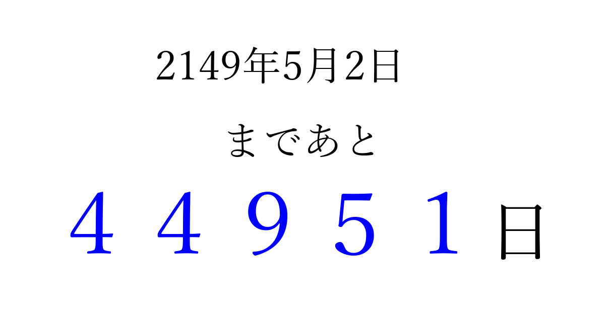2149年5月2日(金)まで あと 99999 日です 追加すると、トップページからすぐ選べるようになります ※2026/04/06現在の結果です。 最新の状態に更新する ↓シェアして、タイムライン上にカウントダウンを表示しよう!↓ 📤 この結果を共有する Tweet シェア Threads Bluesky 別の日付でカウントダウン 2149年5月のカレンダー このページをブックマークに追加すると、いつでもカウントダウンを確認できます。 (PC: Ctrl+D / Mac: ⌘+D) hitome-notes.comでは以下のページも運営しています。 指定日と期間から日付を計算 | ガチャ確率計算・シミュレーション | プライバシー・ポリシー 運営者:Avocado