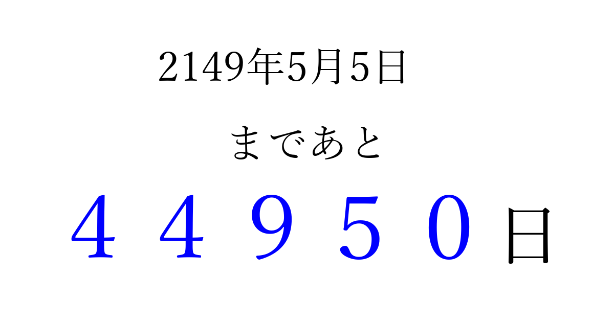 2149年5月5日(月)まで あと 99999 日です 追加すると、トップページからすぐ選べるようになります ※2026/04/10現在の結果です。 最新の状態に更新する ↓シェアして、タイムライン上にカウントダウンを表示しよう!↓ 📤 この結果を共有する Tweet シェア Threads Bluesky 別の日付でカウントダウン 2149年5月のカレンダー このページをブックマークに追加すると、いつでもカウントダウンを確認できます。 (PC: Ctrl+D / Mac: ⌘+D) hitome-notes.comでは以下のページも運営しています。 指定日と期間から日付を計算 | ガチャ確率計算・シミュレーション | プライバシー・ポリシー 運営者:Avocado