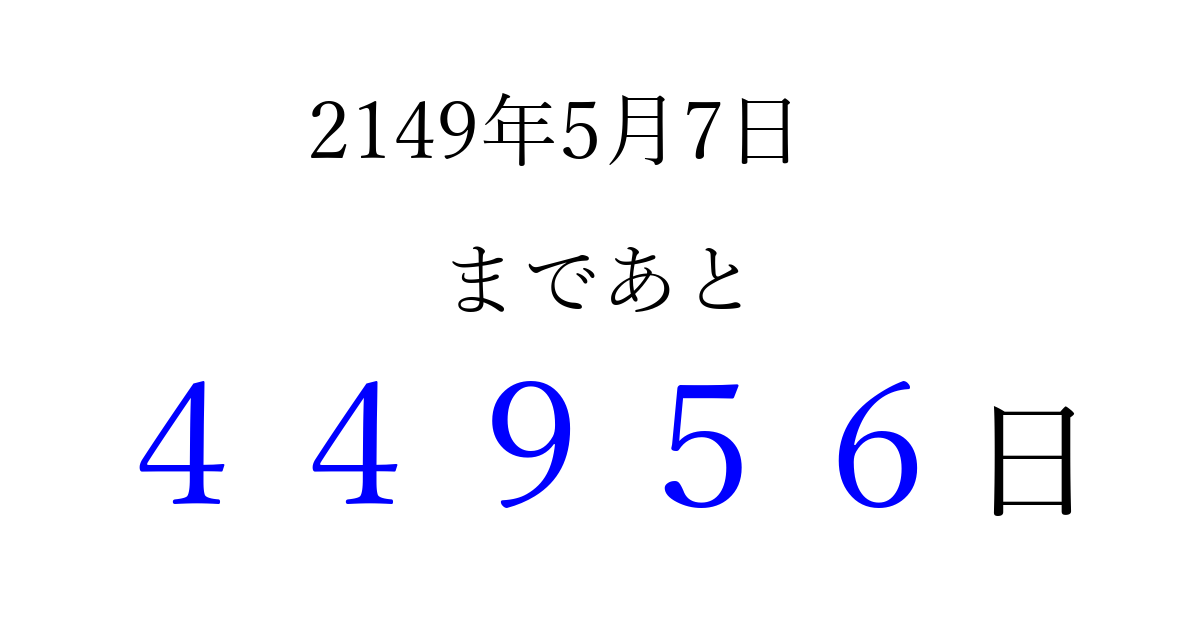 2149年5月7日(水)まで あと 99999 日です 追加すると、トップページからすぐ選べるようになります ※2026/04/06現在の結果です。 最新の状態に更新する ↓シェアして、タイムライン上にカウントダウンを表示しよう!↓ 📤 この結果を共有する Tweet シェア Threads Bluesky 別の日付でカウントダウン 2149年5月のカレンダー このページをブックマークに追加すると、いつでもカウントダウンを確認できます。 (PC: Ctrl+D / Mac: ⌘+D) hitome-notes.comでは以下のページも運営しています。 指定日と期間から日付を計算 | ガチャ確率計算・シミュレーション | プライバシー・ポリシー 運営者:Avocado