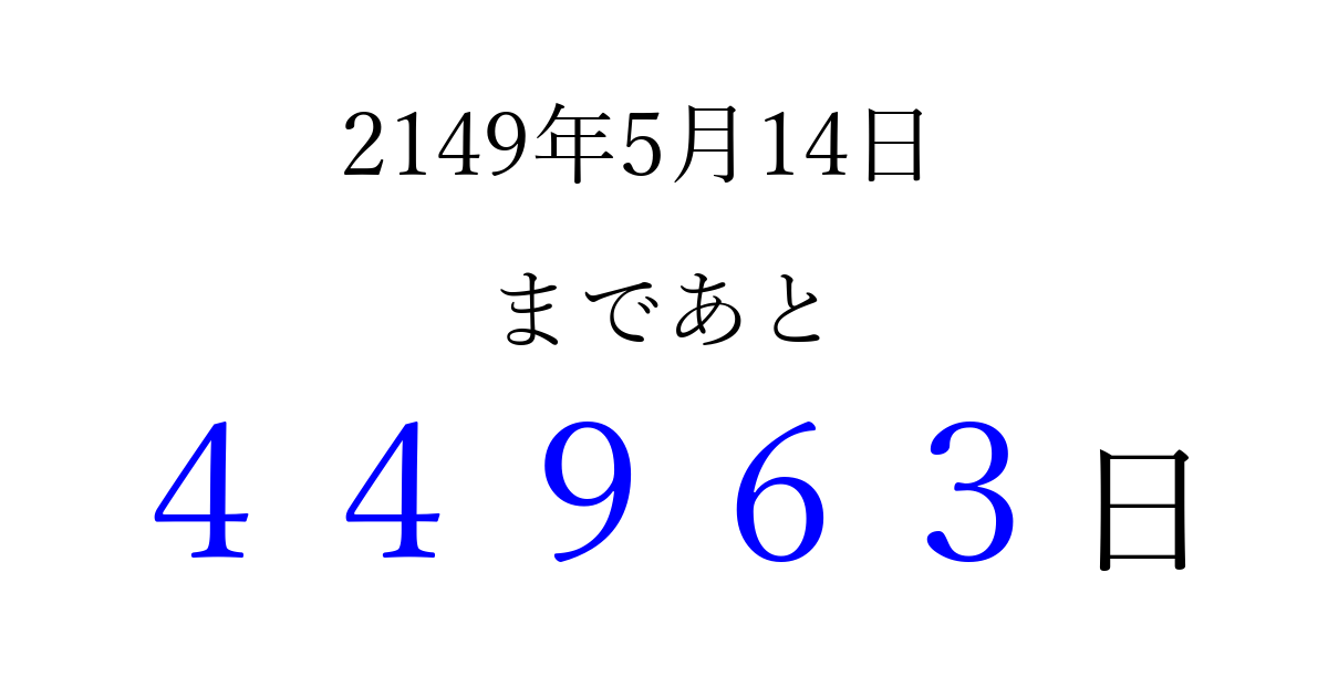 2149年5月14日(水)まで あと 99999 日です 追加すると、トップページからすぐ選べるようになります ※2026/04/06現在の結果です。 最新の状態に更新する ↓シェアして、タイムライン上にカウントダウンを表示しよう!↓ 📤 この結果を共有する Tweet シェア Threads Bluesky 別の日付でカウントダウン 2149年5月のカレンダー このページをブックマークに追加すると、いつでもカウントダウンを確認できます。 (PC: Ctrl+D / Mac: ⌘+D) hitome-notes.comでは以下のページも運営しています。 指定日と期間から日付を計算 | ガチャ確率計算・シミュレーション | プライバシー・ポリシー 運営者:Avocado
