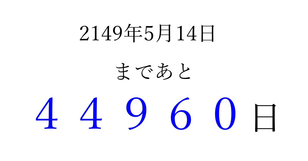 2149年5月14日(水)まで あと 99999 日です 追加すると、トップページからすぐ選べるようになります ※2026/04/09現在の結果です。 最新の状態に更新する ↓シェアして、タイムライン上にカウントダウンを表示しよう!↓ 📤 この結果を共有する Tweet シェア Threads Bluesky 別の日付でカウントダウン 2149年5月のカレンダー このページをブックマークに追加すると、いつでもカウントダウンを確認できます。 (PC: Ctrl+D / Mac: ⌘+D) hitome-notes.comでは以下のページも運営しています。 指定日と期間から日付を計算 | ガチャ確率計算・シミュレーション | プライバシー・ポリシー 運営者:Avocado