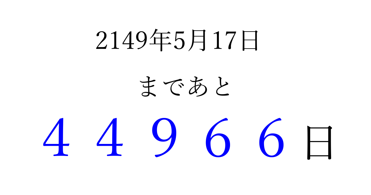 2149年5月17日(土)まで あと 99999 日です 追加すると、トップページからすぐ選べるようになります ※2026/04/06現在の結果です。 最新の状態に更新する ↓シェアして、タイムライン上にカウントダウンを表示しよう!↓ 📤 この結果を共有する Tweet シェア Threads Bluesky 別の日付でカウントダウン 2149年5月のカレンダー このページをブックマークに追加すると、いつでもカウントダウンを確認できます。 (PC: Ctrl+D / Mac: ⌘+D) hitome-notes.comでは以下のページも運営しています。 指定日と期間から日付を計算 | ガチャ確率計算・シミュレーション | プライバシー・ポリシー 運営者:Avocado