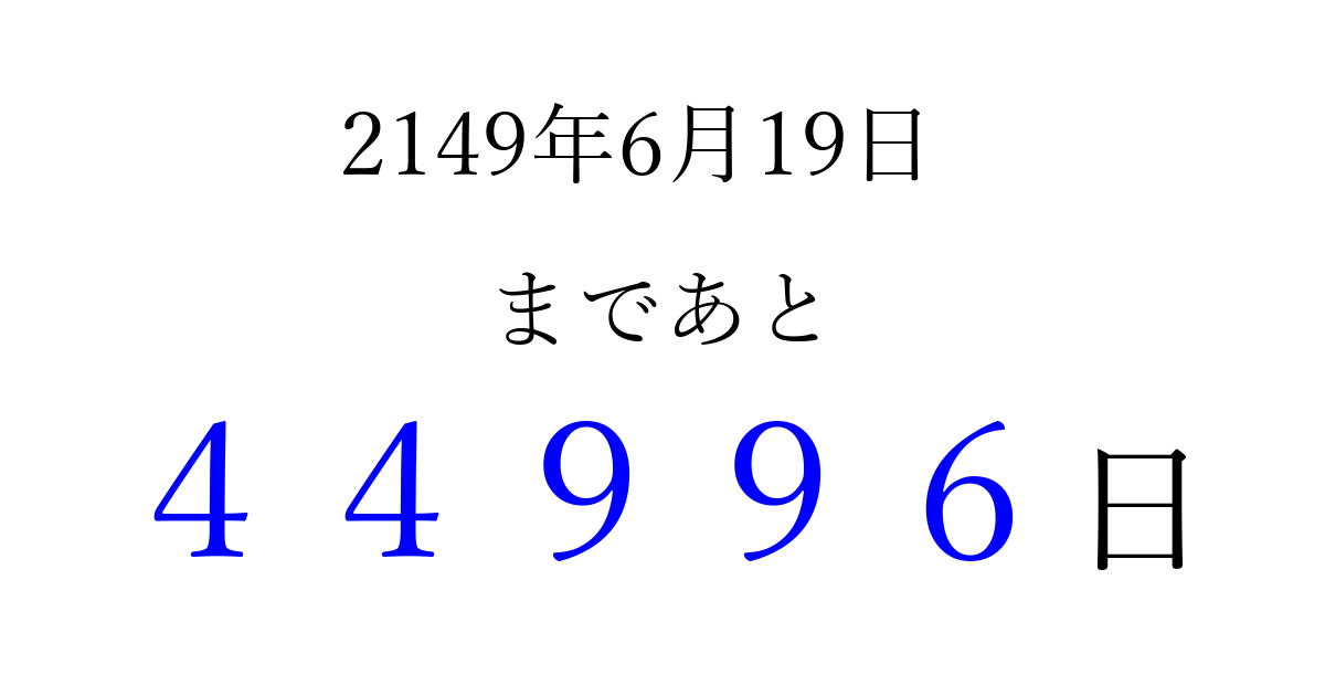 2149年6月19日(木)まで あと 99999 日です 追加すると、トップページからすぐ選べるようになります ※2026/04/09現在の結果です。 最新の状態に更新する ↓シェアして、タイムライン上にカウントダウンを表示しよう!↓ 📤 この結果を共有する Tweet シェア Threads Bluesky 別の日付でカウントダウン 2149年6月のカレンダー このページをブックマークに追加すると、いつでもカウントダウンを確認できます。 (PC: Ctrl+D / Mac: ⌘+D) hitome-notes.comでは以下のページも運営しています。 指定日と期間から日付を計算 | ガチャ確率計算・シミュレーション | プライバシー・ポリシー 運営者:Avocado