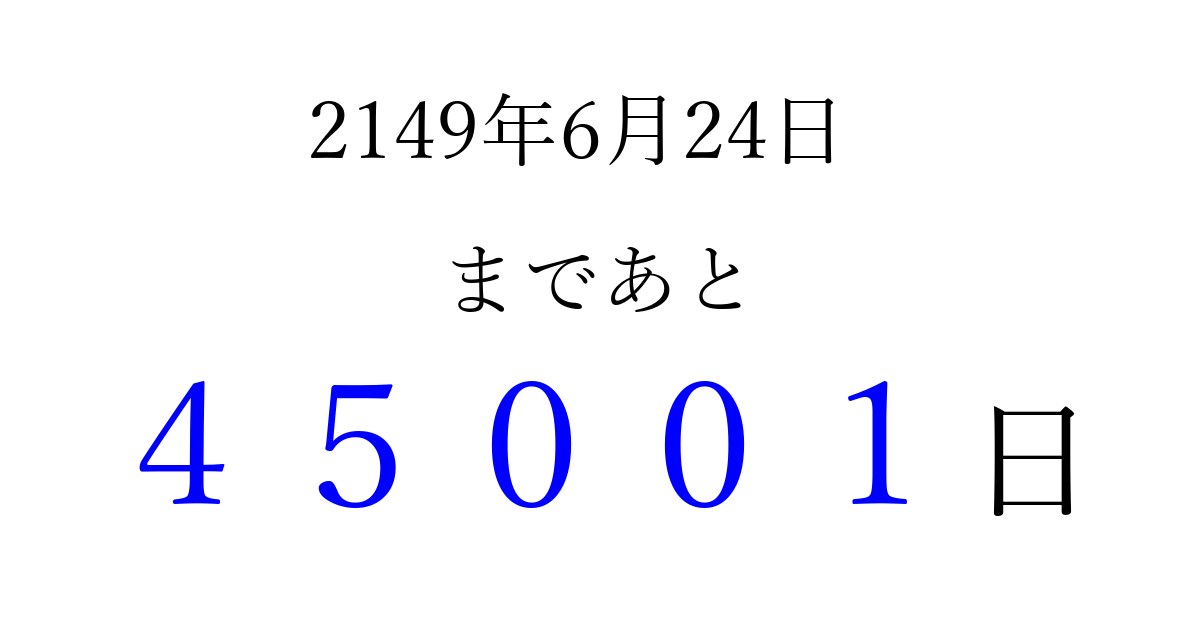 2149年6月24日(火)まで あと 99999 日です 追加すると、トップページからすぐ選べるようになります ※2026/04/09現在の結果です。 最新の状態に更新する ↓シェアして、タイムライン上にカウントダウンを表示しよう!↓ 📤 この結果を共有する Tweet シェア Threads Bluesky 別の日付でカウントダウン 2149年6月のカレンダー このページをブックマークに追加すると、いつでもカウントダウンを確認できます。 (PC: Ctrl+D / Mac: ⌘+D) hitome-notes.comでは以下のページも運営しています。 指定日と期間から日付を計算 | ガチャ確率計算・シミュレーション | プライバシー・ポリシー 運営者:Avocado