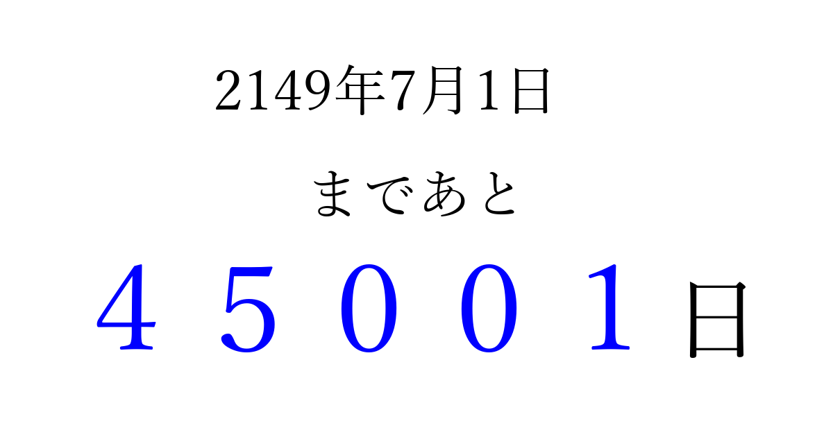 2149年7月1日(火)まで あと 99999 日です 追加すると、トップページからすぐ選べるようになります ※2026/04/16現在の結果です。 最新の状態に更新する ↓シェアして、タイムライン上にカウントダウンを表示しよう!↓ 📤 この結果を共有する Tweet シェア Threads Bluesky 別の日付でカウントダウン 2149年7月のカレンダー このページをブックマークに追加すると、いつでもカウントダウンを確認できます。 (PC: Ctrl+D / Mac: ⌘+D) hitome-notes.comでは以下のページも運営しています。 指定日と期間から日付を計算 | ガチャ確率計算・シミュレーション | プライバシー・ポリシー 運営者:Avocado