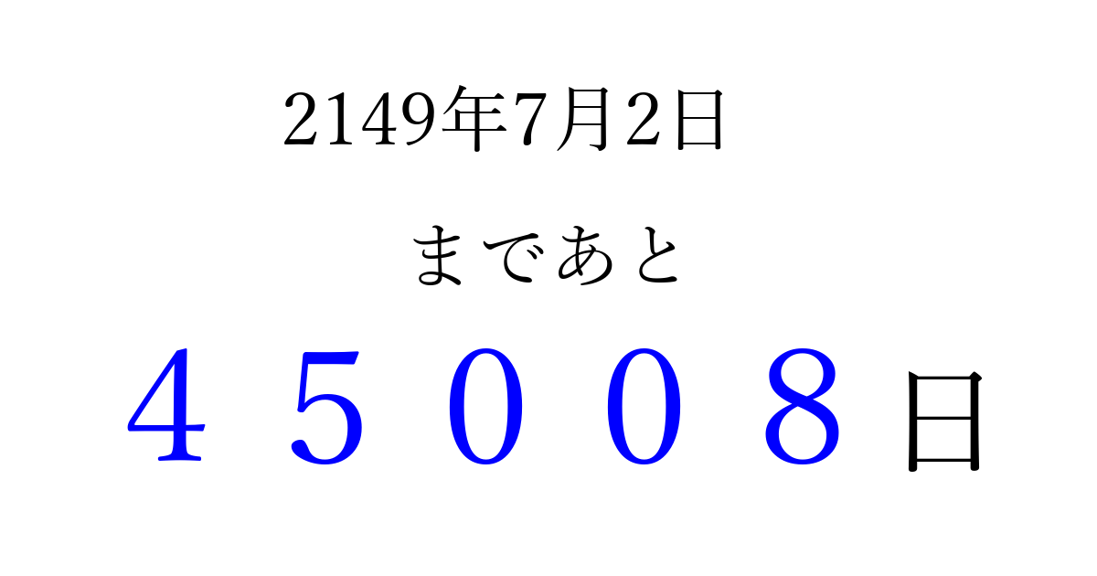 2149年7月2日(水)まで あと 99999 日です 追加すると、トップページからすぐ選べるようになります ※2026/04/10現在の結果です。 最新の状態に更新する ↓シェアして、タイムライン上にカウントダウンを表示しよう!↓ 📤 この結果を共有する Tweet シェア Threads Bluesky 別の日付でカウントダウン 2149年7月のカレンダー このページをブックマークに追加すると、いつでもカウントダウンを確認できます。 (PC: Ctrl+D / Mac: ⌘+D) hitome-notes.comでは以下のページも運営しています。 指定日と期間から日付を計算 | ガチャ確率計算・シミュレーション | プライバシー・ポリシー 運営者:Avocado