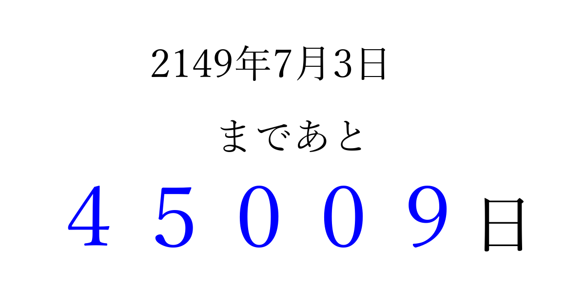 2149年7月3日(木)まで あと 99999 日です 追加すると、トップページからすぐ選べるようになります ※2026/04/10現在の結果です。 最新の状態に更新する ↓シェアして、タイムライン上にカウントダウンを表示しよう!↓ 📤 この結果を共有する Tweet シェア Threads Bluesky 別の日付でカウントダウン 2149年7月のカレンダー このページをブックマークに追加すると、いつでもカウントダウンを確認できます。 (PC: Ctrl+D / Mac: ⌘+D) hitome-notes.comでは以下のページも運営しています。 指定日と期間から日付を計算 | ガチャ確率計算・シミュレーション | プライバシー・ポリシー 運営者:Avocado