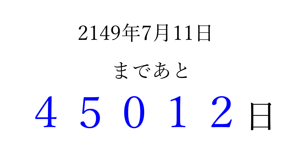 2149年7月11日(金)まで あと 99999 日です 追加すると、トップページからすぐ選べるようになります ※2026/04/15現在の結果です。 最新の状態に更新する ↓シェアして、タイムライン上にカウントダウンを表示しよう!↓ 📤 この結果を共有する Tweet シェア Threads Bluesky 別の日付でカウントダウン 2149年7月のカレンダー このページをブックマークに追加すると、いつでもカウントダウンを確認できます。 (PC: Ctrl+D / Mac: ⌘+D) hitome-notes.comでは以下のページも運営しています。 指定日と期間から日付を計算 | ガチャ確率計算・シミュレーション | プライバシー・ポリシー 運営者:Avocado