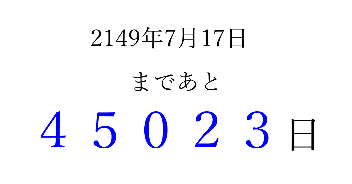 2149年7月17日(木)まで あと 99999 日です 追加すると、トップページからすぐ選べるようになります ※2026/04/10現在の結果です。 最新の状態に更新する ↓シェアして、タイムライン上にカウントダウンを表示しよう!↓ 📤 この結果を共有する Tweet シェア Threads Bluesky 別の日付でカウントダウン 2149年7月のカレンダー このページをブックマークに追加すると、いつでもカウントダウンを確認できます。 (PC: Ctrl+D / Mac: ⌘+D) hitome-notes.comでは以下のページも運営しています。 指定日と期間から日付を計算 | ガチャ確率計算・シミュレーション | プライバシー・ポリシー 運営者:Avocado