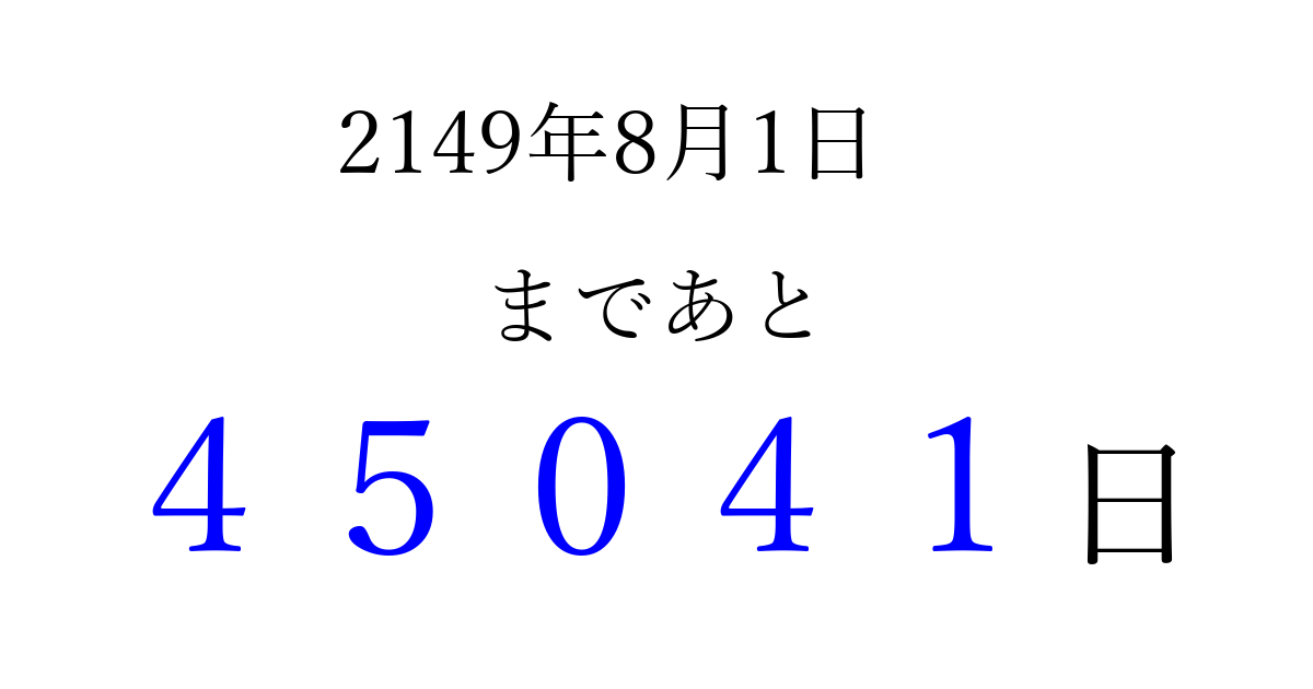 2149年8月1日(金)まで あと 99999 日です 追加すると、トップページからすぐ選べるようになります ※2026/04/07現在の結果です。 最新の状態に更新する ↓シェアして、タイムライン上にカウントダウンを表示しよう!↓ 📤 この結果を共有する Tweet シェア Threads Bluesky 別の日付でカウントダウン 2149年8月のカレンダー このページをブックマークに追加すると、いつでもカウントダウンを確認できます。 (PC: Ctrl+D / Mac: ⌘+D) hitome-notes.comでは以下のページも運営しています。 指定日と期間から日付を計算 | ガチャ確率計算・シミュレーション | プライバシー・ポリシー 運営者:Avocado