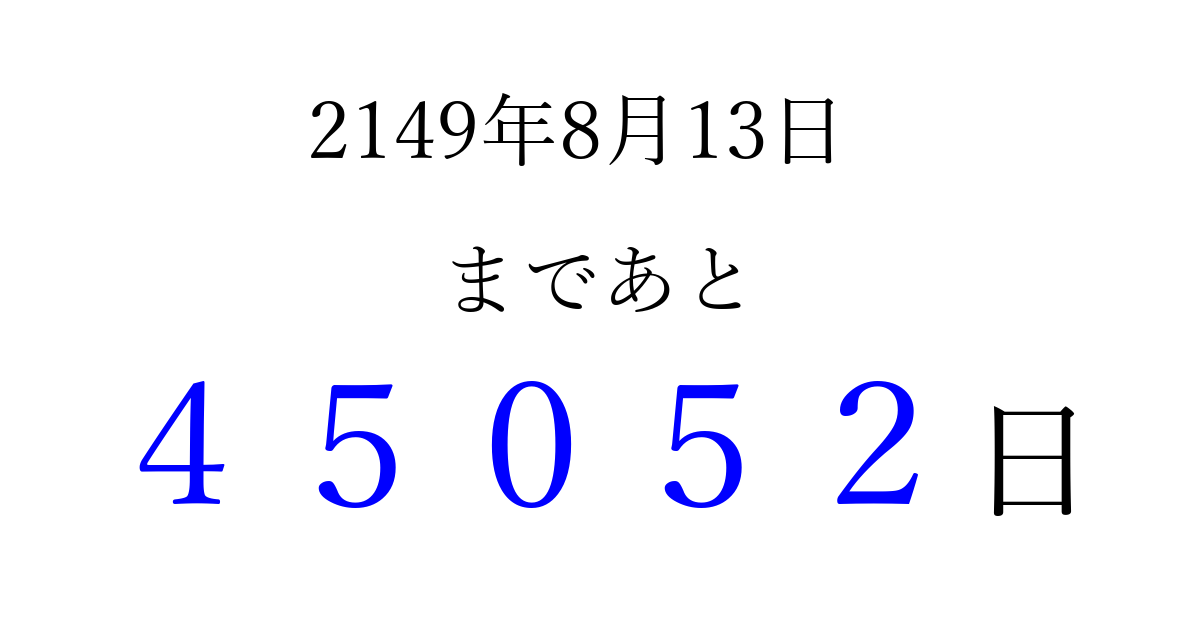 2149年8月13日(水)まで あと 99999 日です 追加すると、トップページからすぐ選べるようになります ※2026/04/08現在の結果です。 最新の状態に更新する ↓シェアして、タイムライン上にカウントダウンを表示しよう!↓ 📤 この結果を共有する Tweet シェア Threads Bluesky 別の日付でカウントダウン 2149年8月のカレンダー このページをブックマークに追加すると、いつでもカウントダウンを確認できます。 (PC: Ctrl+D / Mac: ⌘+D) hitome-notes.comでは以下のページも運営しています。 指定日と期間から日付を計算 | ガチャ確率計算・シミュレーション | プライバシー・ポリシー 運営者:Avocado